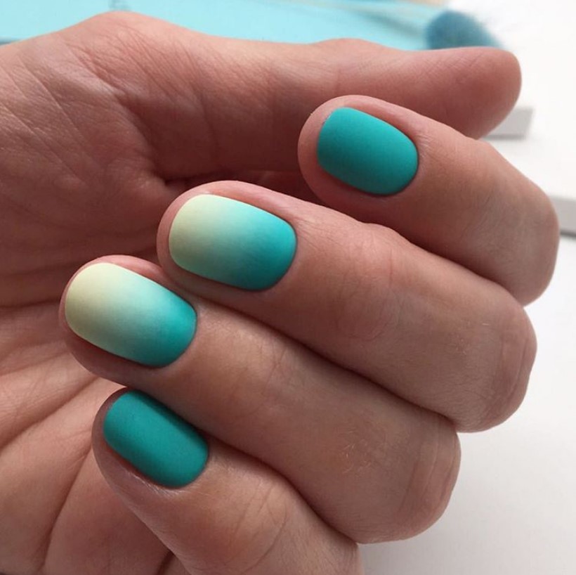 Если вы не можете устоять против сверкающего маникюра, вам придется по вкусу такой дизайн ногтей, когда основание покрыто зелеными блестками, а кончики – синим глянцем. Для лета отлично подходит полосатый рисунок в виде горизонтальных или вертикальных зеленых и синих полос.