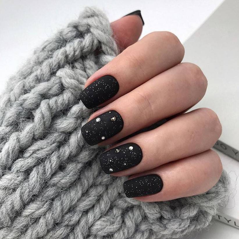 Темный матовый маникюр эффектен в бархатном и велюровом исполнении. Разнообразные блестящие элементы декора больше уместны для монохромного матового покрытия.