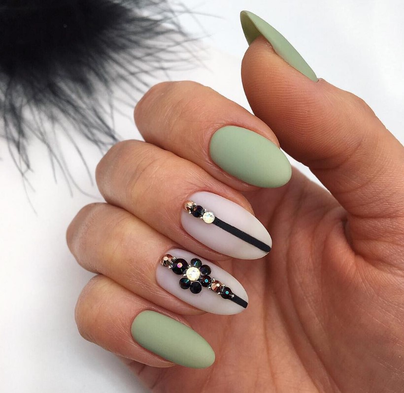 - “Оливка в Мартини”. Необычный оттенок, сочетающий в себе сразу два модных на сегодня цвета, таких как оливковый и хаки. Он очень эффектно смотрится в однотонном дизайне и максимум, что можно к нему добавить — это россыпь камней Сваровски.