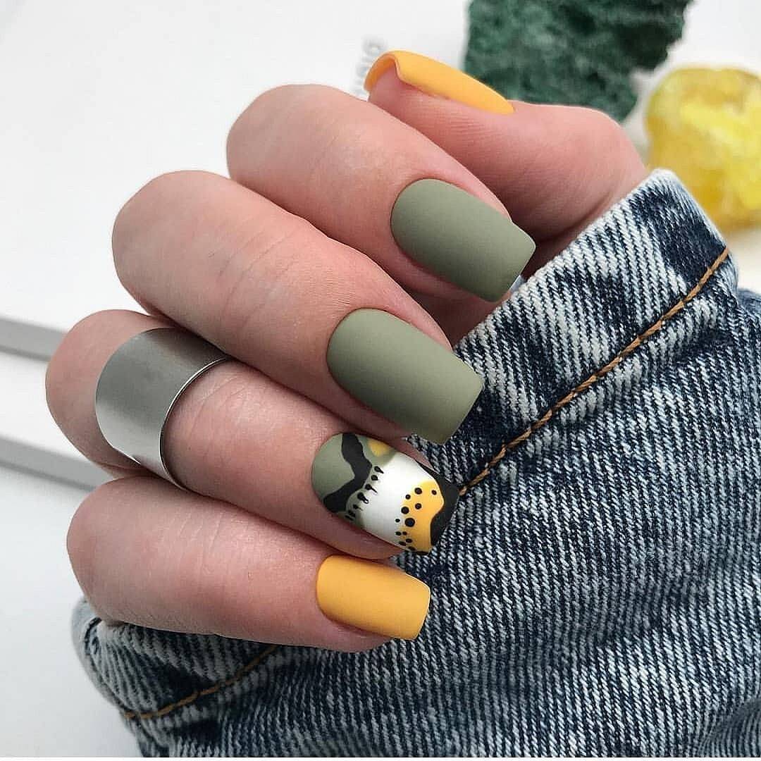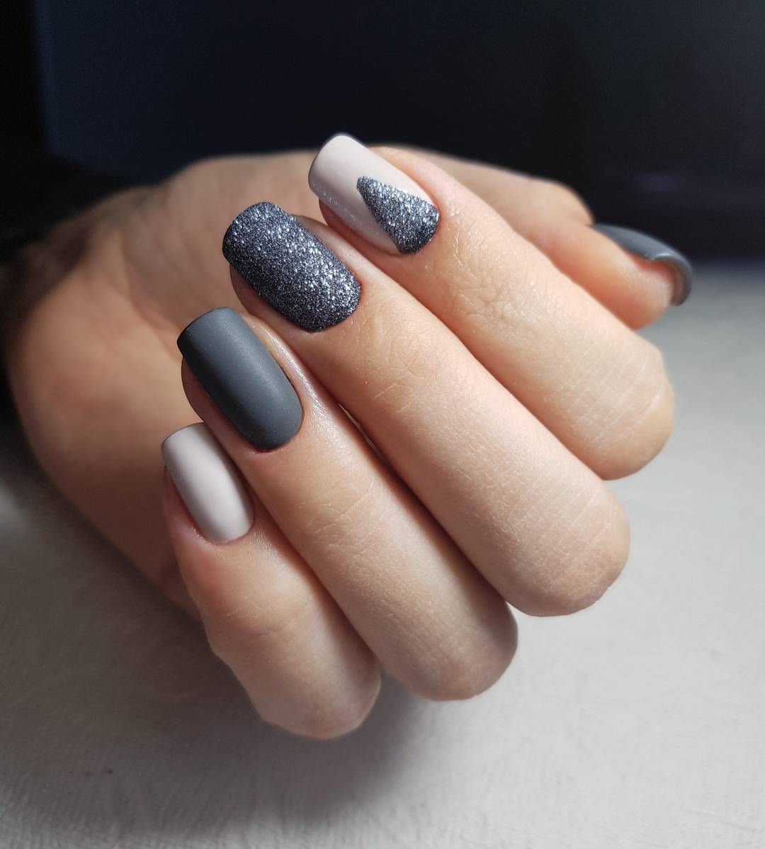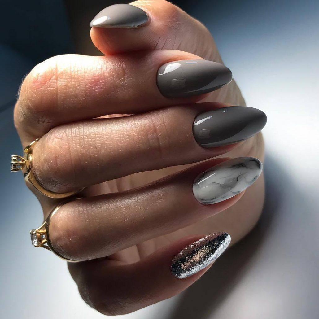 Модным оттенком в дизайне ногтей этой осенью будет серый. Такие «бетонные» матовые ногти очень эффектно смотрятся с паутинками, «перепелиными» рисунками и с мраморными пятнами.