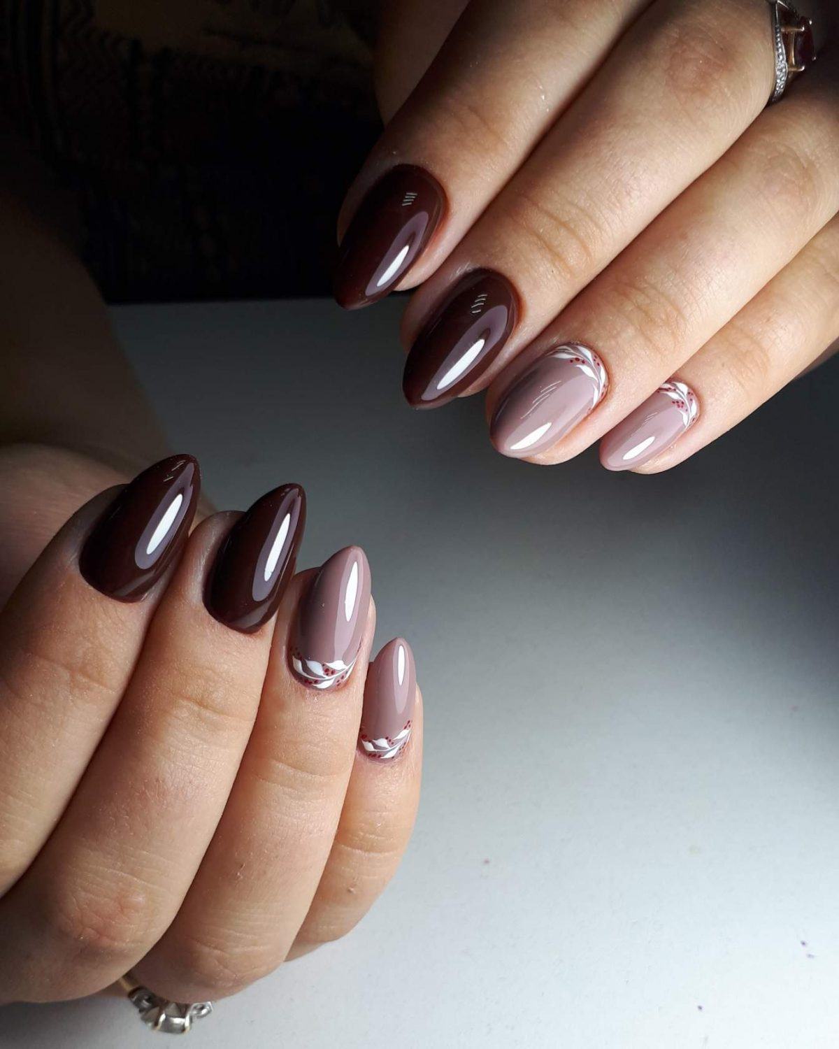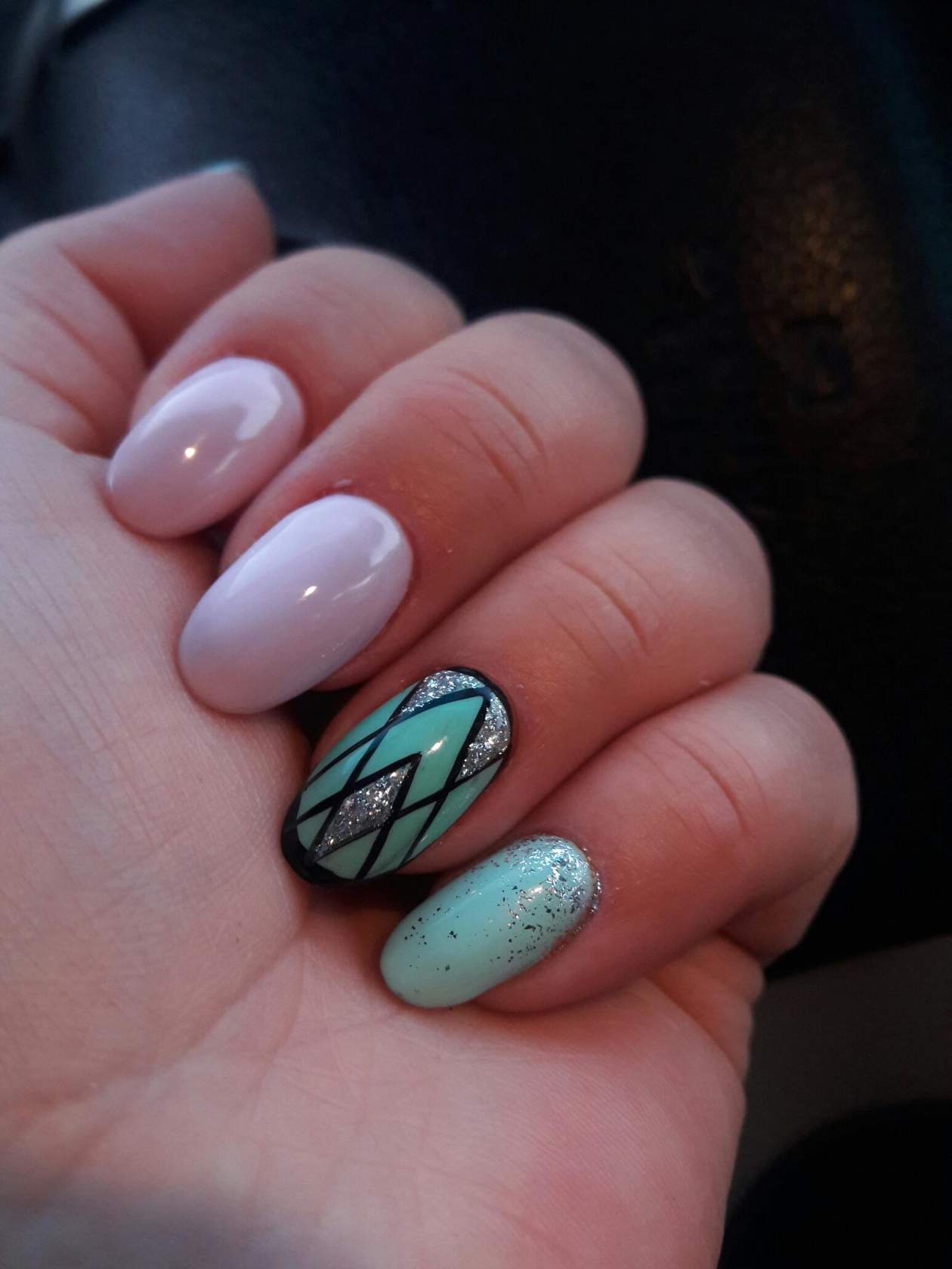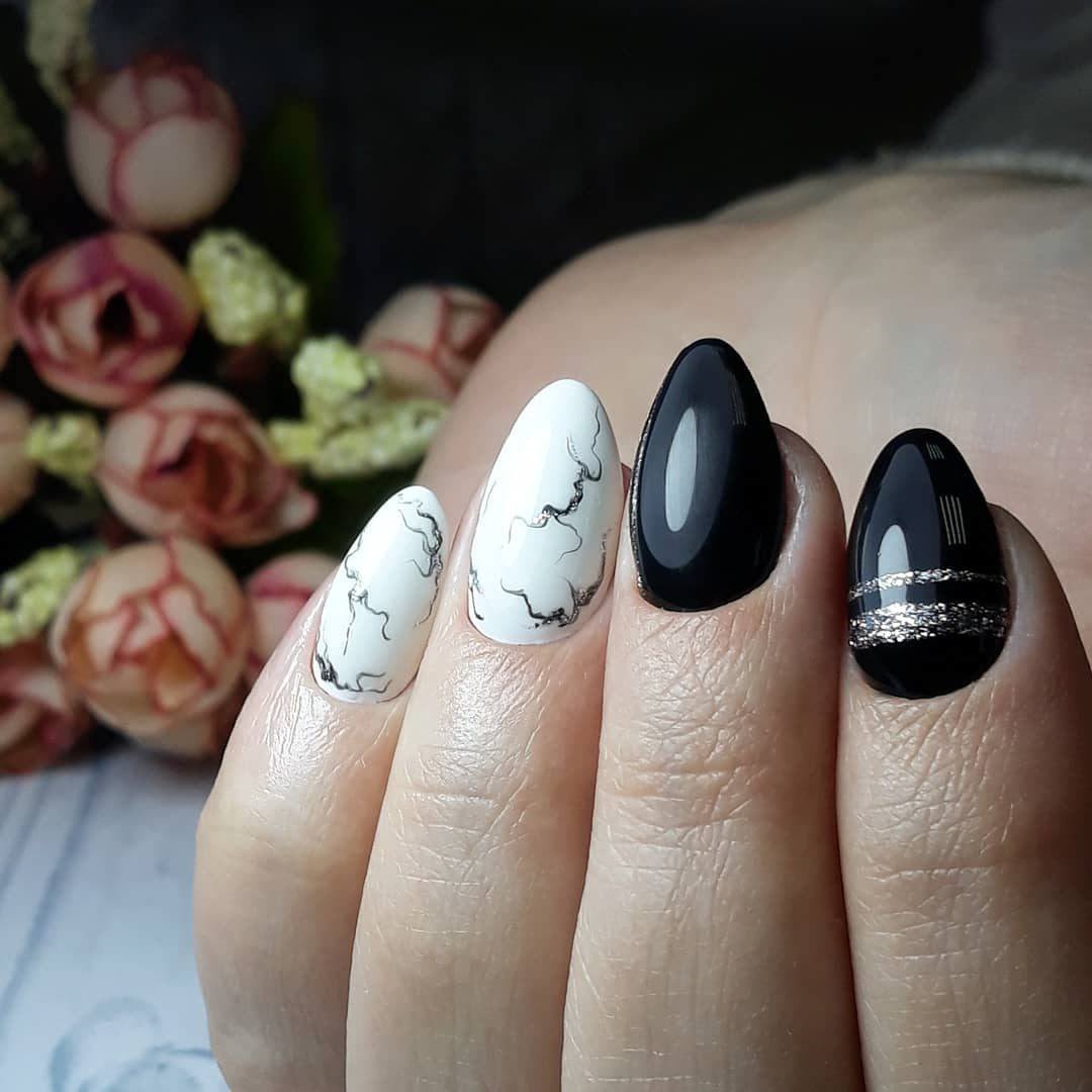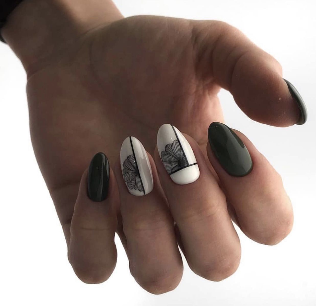 темный и черный цвет лака в сочетании с яркими или белыми оттенками поможет создать драматический образ. Такой красивый дизайн маникюра будет удачно смотреться на вечернем мероприятии;