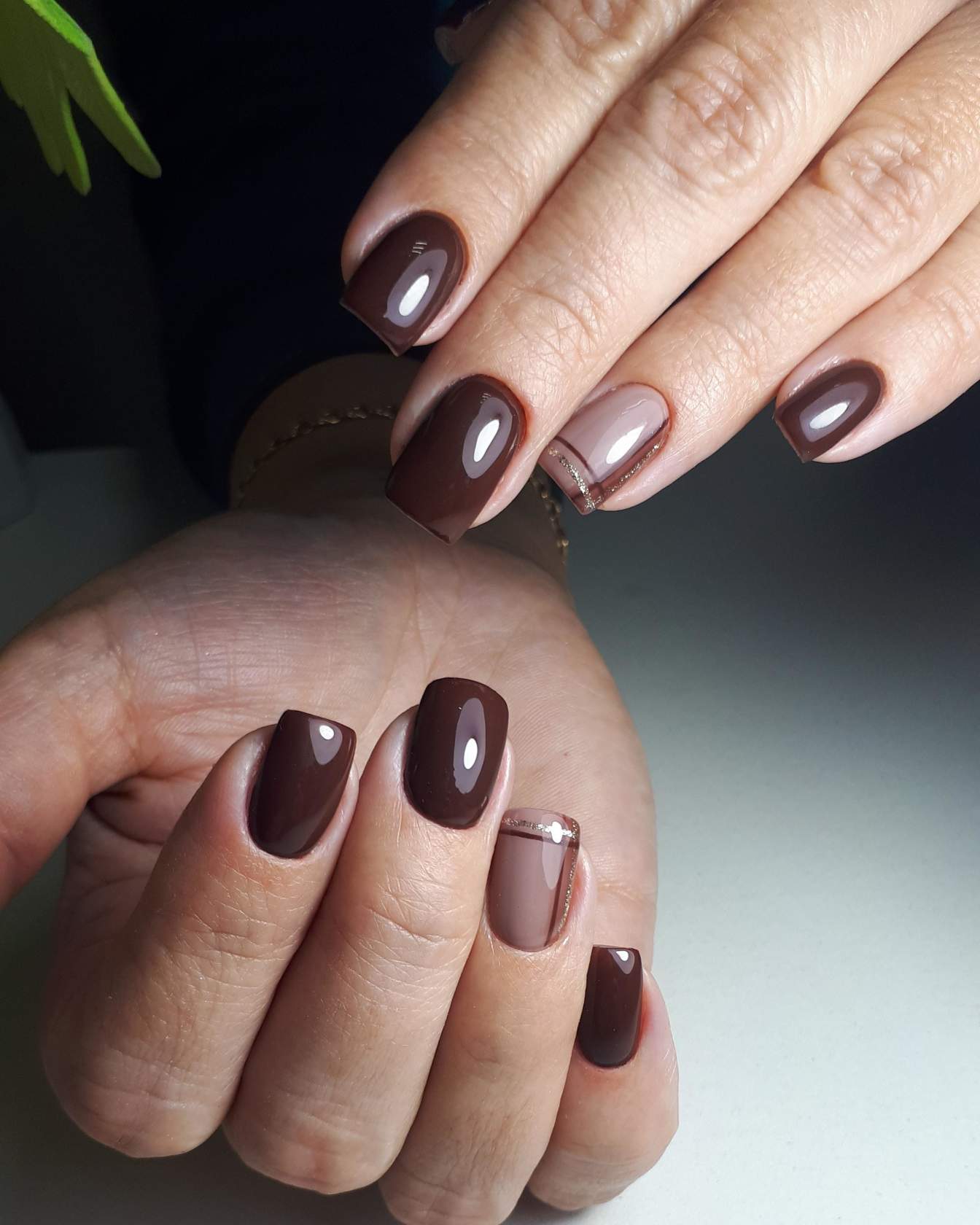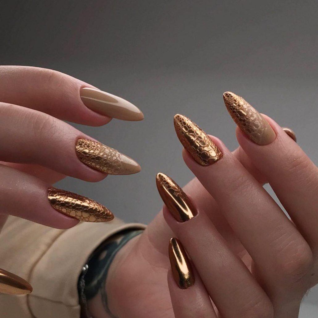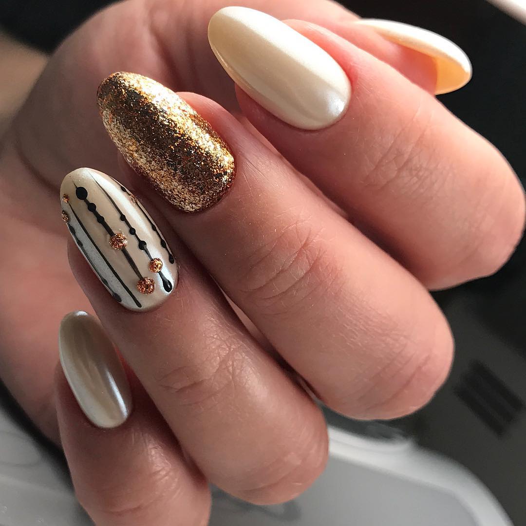 Золото в тренде. В сезоне осень-зима 2021-2022 в моде блеск. Тонкая полоска золотого лака на кончике смотрится очень интересно.