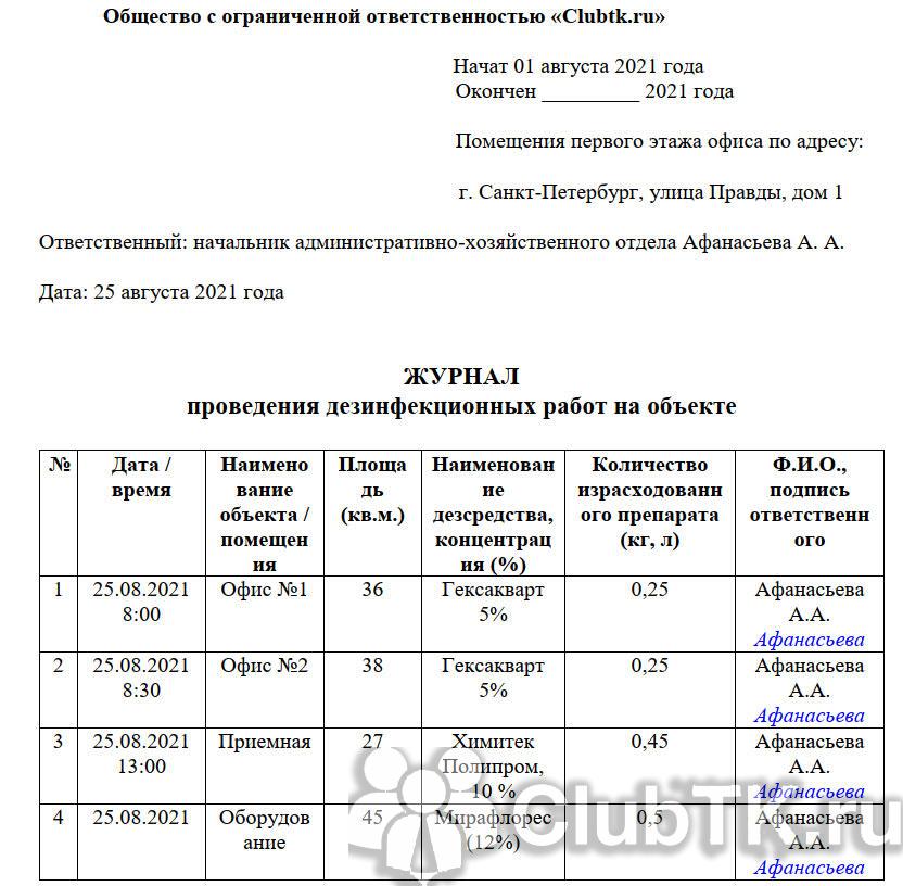 - фамилия, имя и подпись сотрудника, осуществившего очистку помещения, и за учет полученных препаратов.