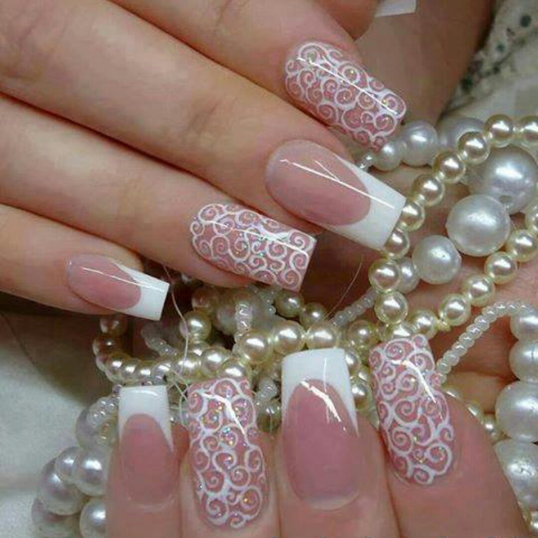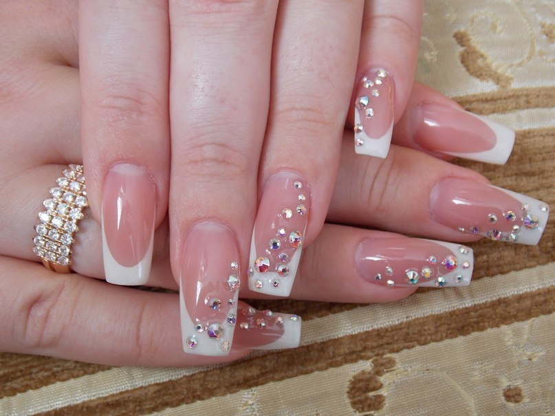 Можно использовать однотонные свадебные или французские ногти и отделать их мини-жемчугом, бриллиантами или кристаллами.