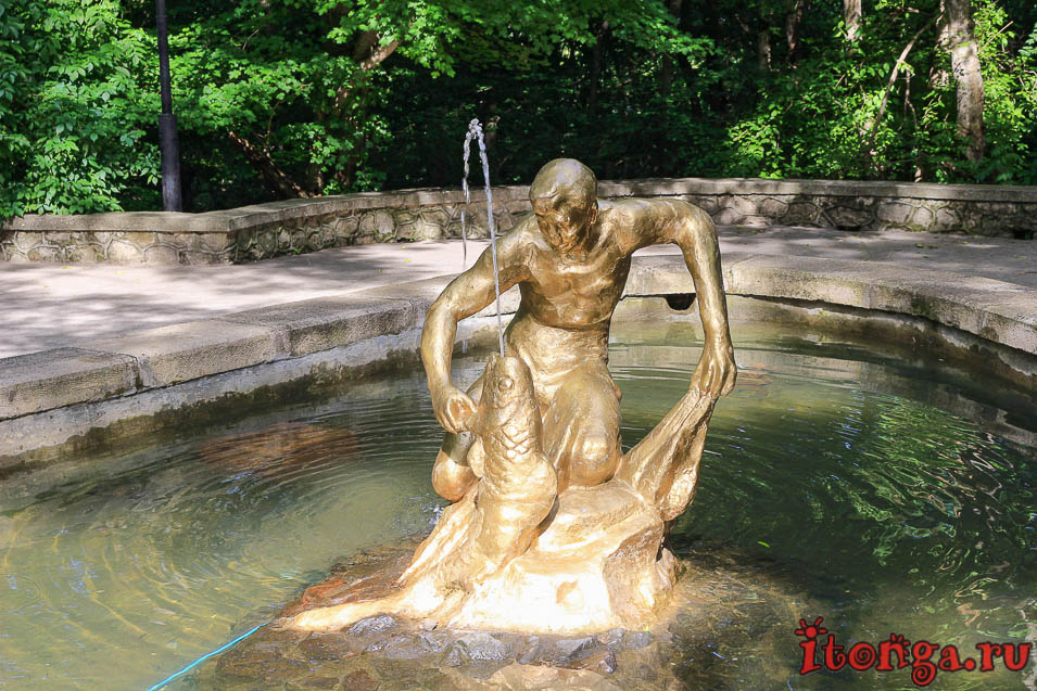 За орлом фонтан в виде рыбака поймавшего рыбу.