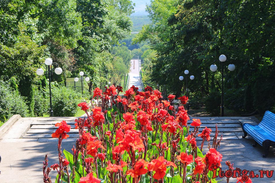 От чаш идёт спуск к площадке, на которой старая каскадная лестница в Железноводске заканчивалась.
