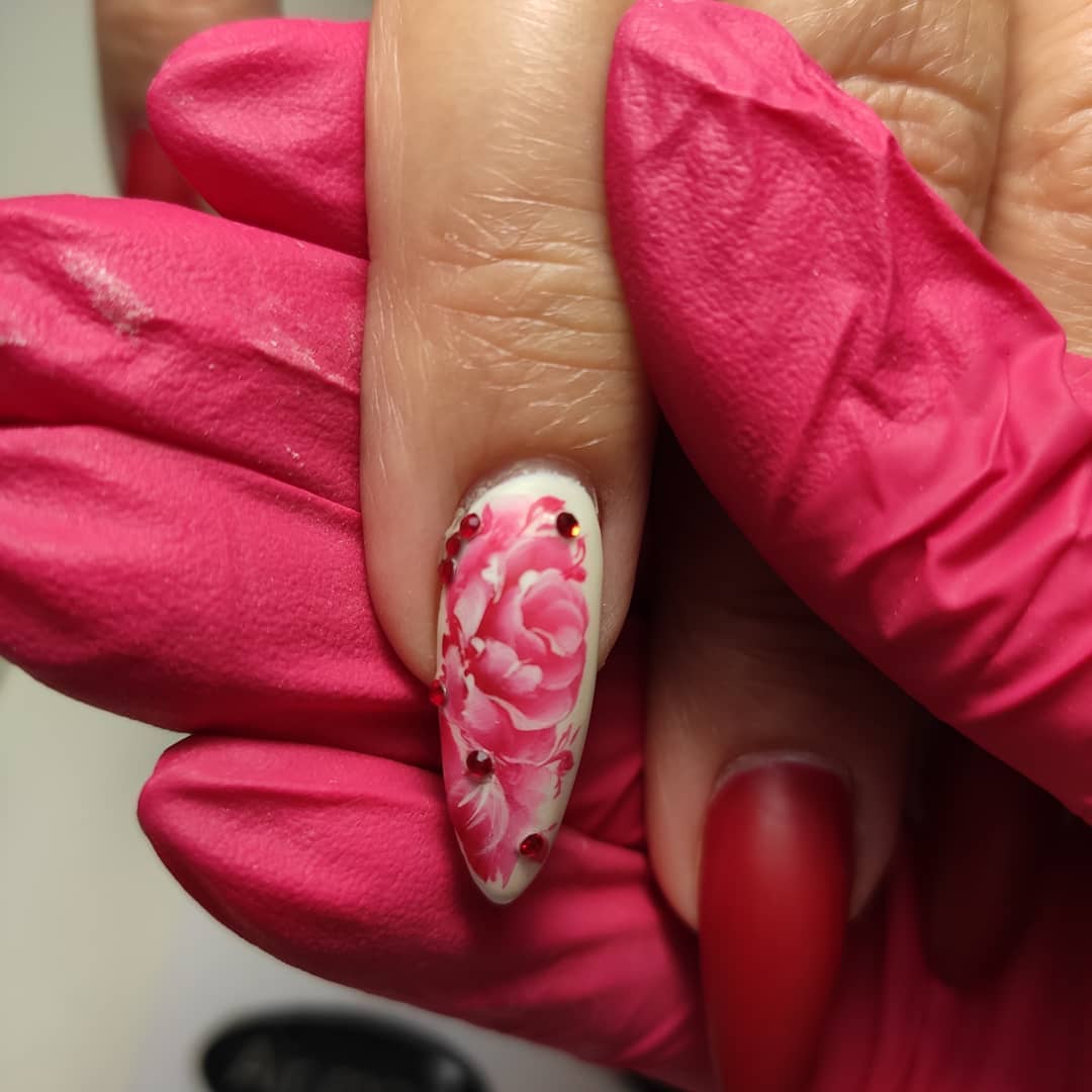 По завершению рисования цветов, мастер обводит лепестки контурами, прорисовывает черенки и прочие мелкие детальки для придания богатства и глубины рисунку. Затем, ноготь с росписью покрывается финишным покрытием.