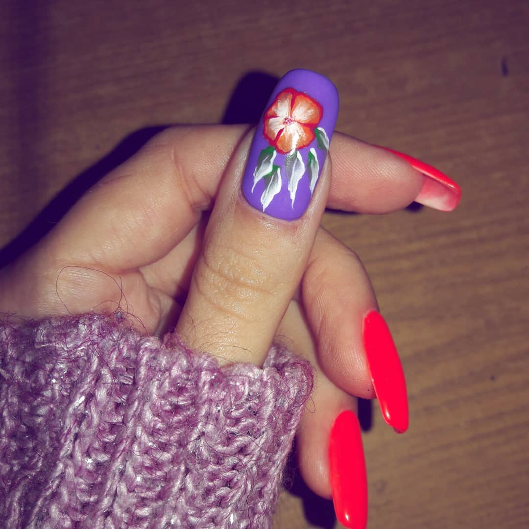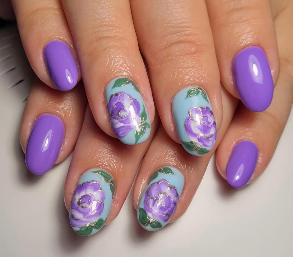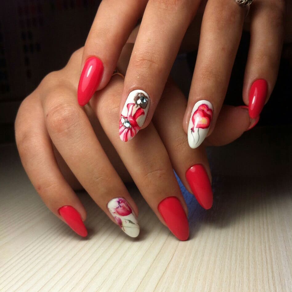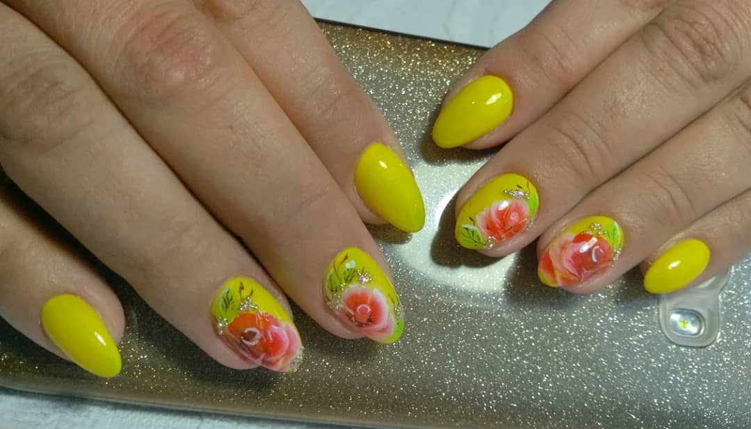 - Цветочным орнаментом с изображениями любимых цветов. Для начала можно попробовать нарисовать обычные ромашки. Сделать такой рисунок смогут даже новички: ставим на середину ногтя маленькую желтую точку, а вокруг нее рисуем короткие полукруглые линии – лепестки. Технологии создания более сложных узоров можно научиться, посмотрев видео о рисунках акрилом на ногтях;