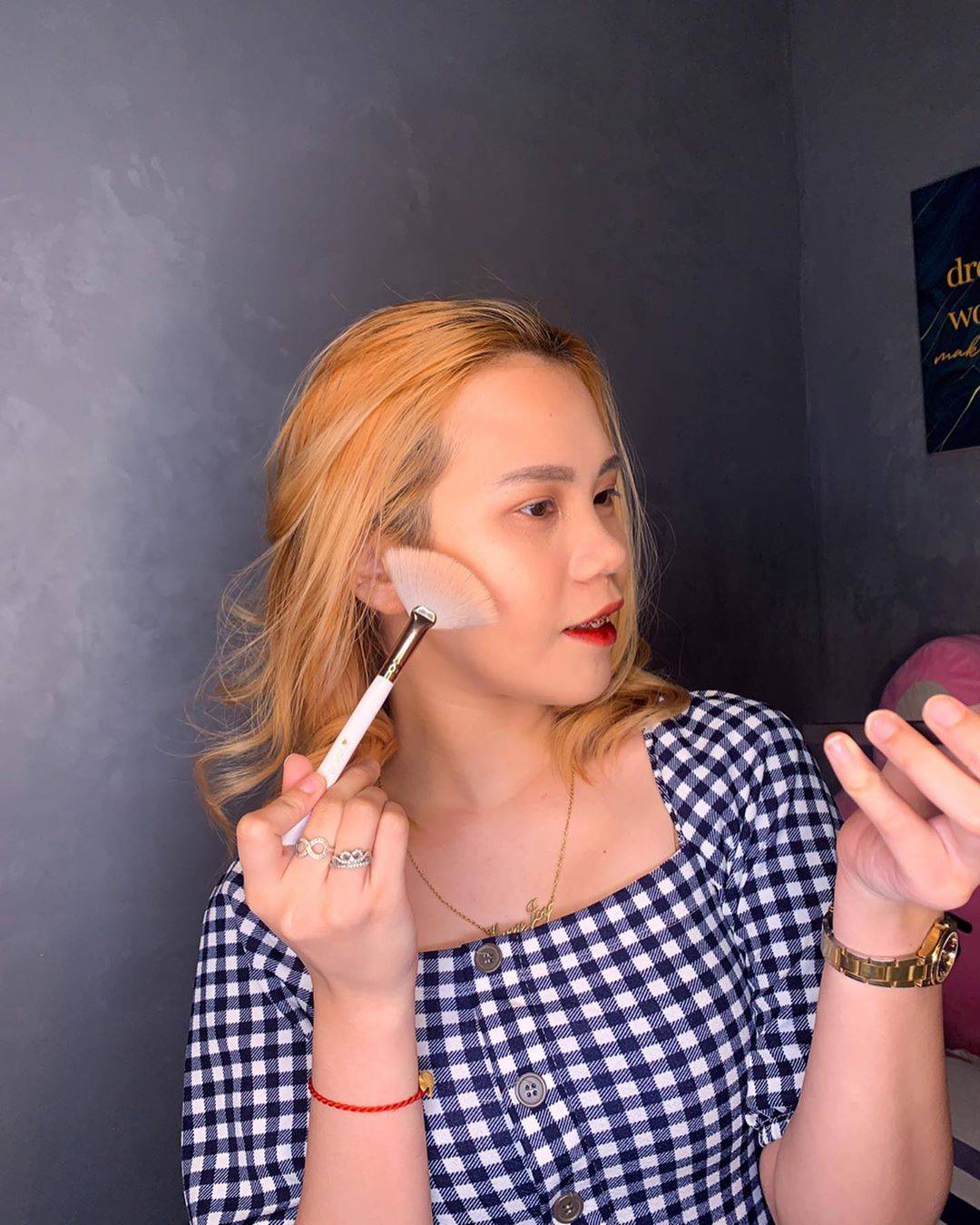 На лицо наносят базу естественного оттенка. Если поры слишком расширены, применяют затирающий состав. Далее с помощью консилера убирают несовершенства дермы. Для достижения эффекта «фарфоровой» кожи лицо покрывают кушоном. Финишем станет пудра, нанесённая пушистой кистью.