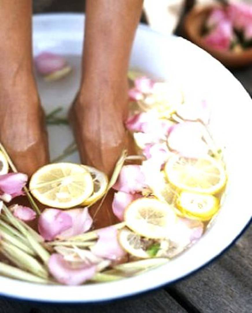 - Для того, чтобы распарить кожу стоп, в ванночку (тазик) нужных размеров наливается тёплая вода, и добавляются нужные компоненты. Это могут быть специальные размягчающие эфирные масла, соль (морская или обычная), мёд, лимон, пенка, травяные настои и т.д. Держать ножки в тёплой (немного горячей) воде необходимо примерно 10-15 минут, чтобы все компоненты успели подействовать.