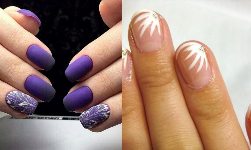 Модных разновидностей маникюра для ногтевых пластин такой формы очень много. К ним относится классический и голливудский френч, который выглядит просто и изысканно. Матовые текстуры лаков тоже часто используются при таком типе. На ногтевую пластину подходящей длины наносят картинки, украшают их блестками, стразами и бисером, используют водную технику, эффект омбре.