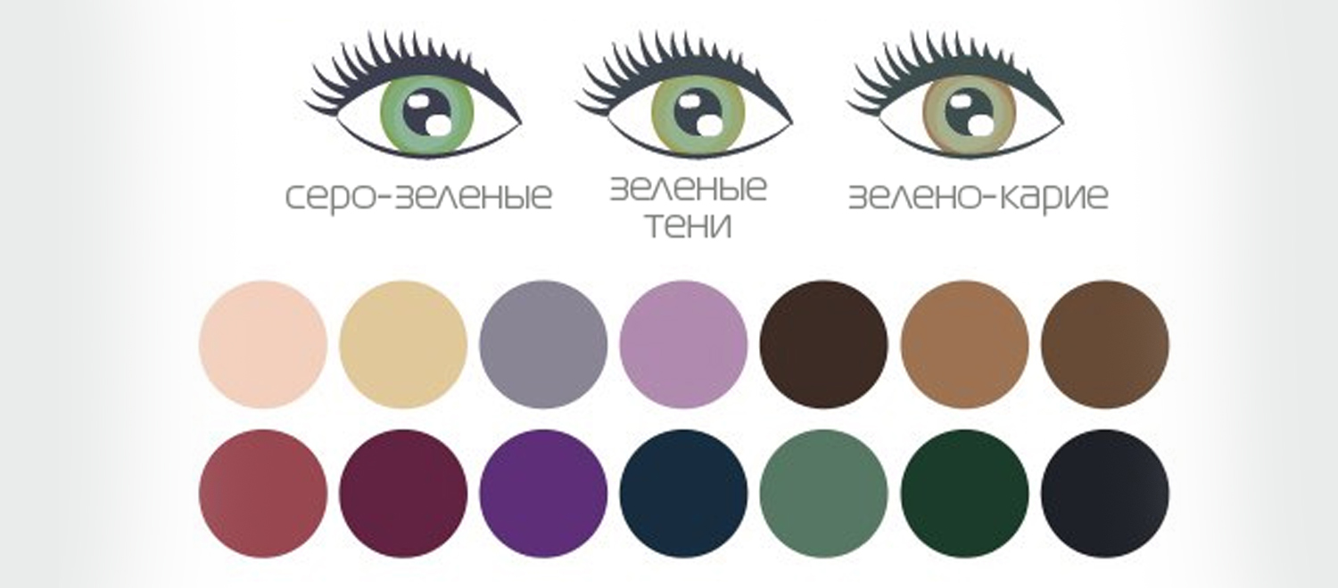 Для зелёного разбавленного жёлтыми искорками цвета глаз идеально подходит фиолетовый. Это связано с тем, что контрастные цвета оттеняют основной тон. Рыжие, жёлтые и песочные тени, превосходящие вкрапления на радужке по насыщенности, тоже отлично гармонируют.