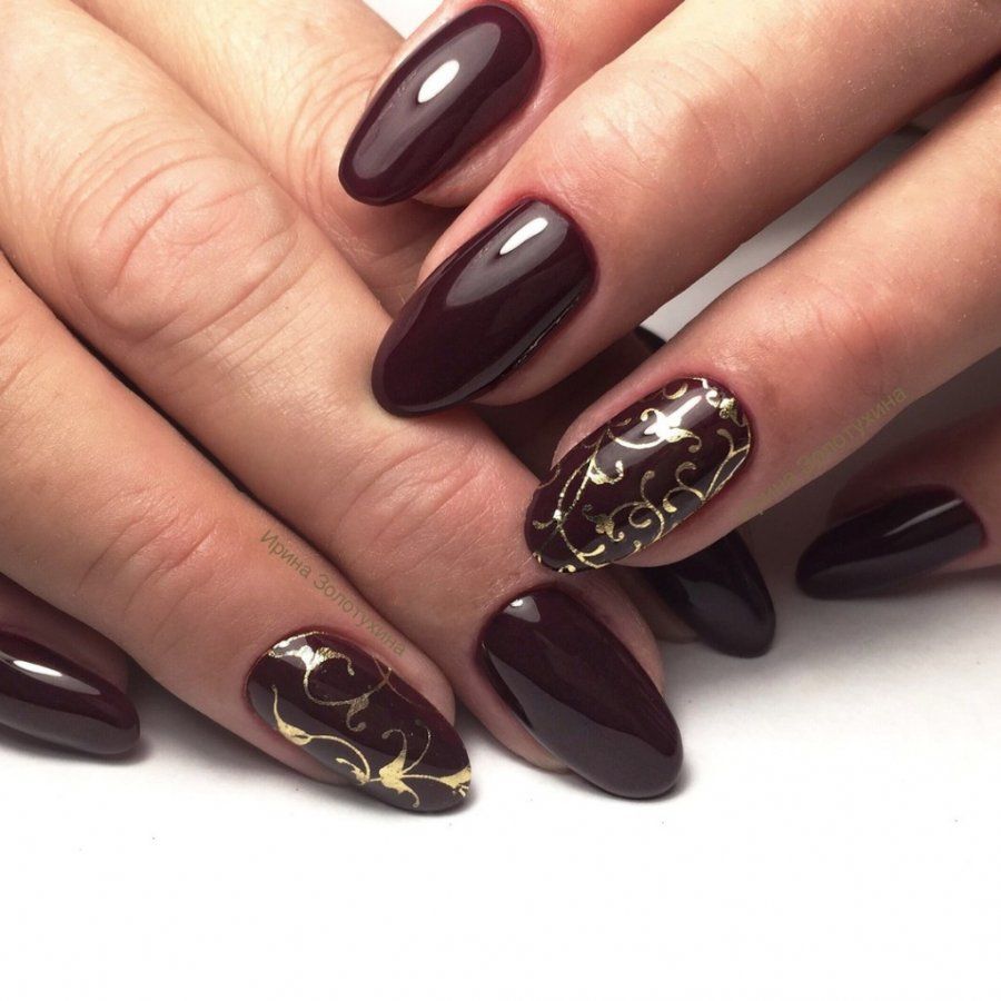 Насыщенный цвет маникюра с рыжеватым отливом — прекрасное решение для рыжеволосых обладательниц золотистой загорелой кожи. В дизайне часто используется сочетание каштанового с теплыми оттенками оранжевого, желтого, красного. Классический вариант — комбинирование матового и глянцевого покрытие, использование акцентов, выполненных золотом.