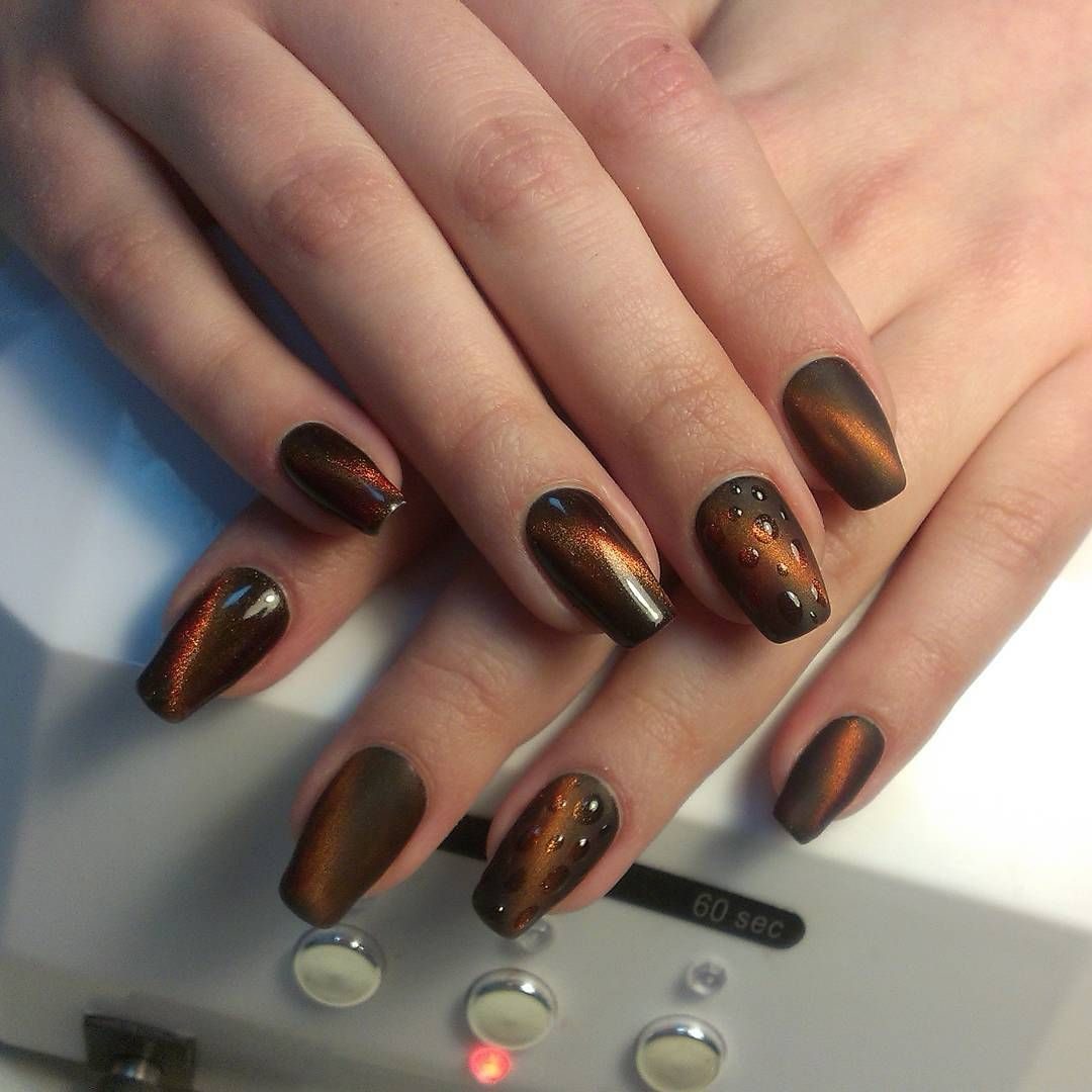 Маникюр с магнитными пигментами смотрится красиво именно с темными насыщенными тонами. Коричневый особенно привлекательно выглядит с дизайном «кошачий глаз». Те, кто хоть раз видел переливы кварцевых камней захотел выполнить на своих ноготках такой же притягательный дизайн. Переливы изумительной красоты смотрятся невероятно красиво и нежно.