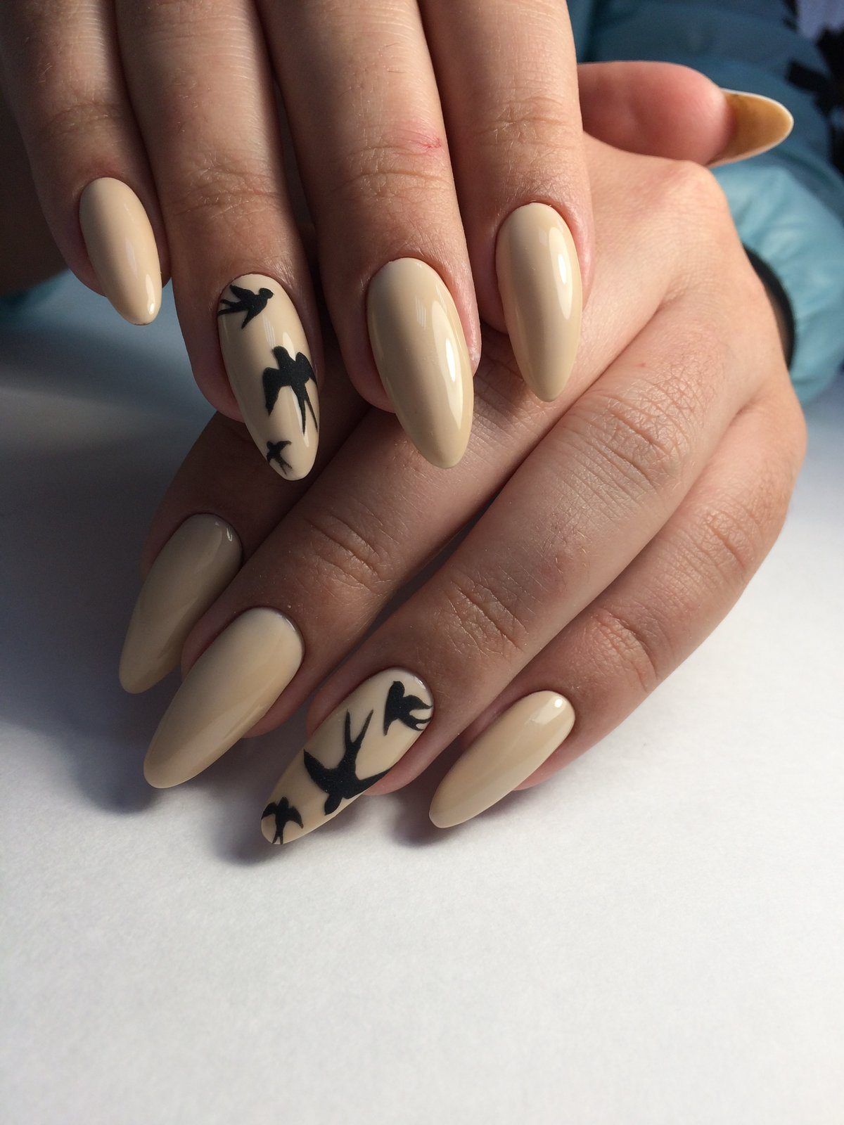 Любителям стиля минимализм предлагаем обратить внимание на нейл-арты с нежными веточками, листьями, животными, птицами. Узор лучше выполнять черным гель-лаком на светло-коричневом фоне