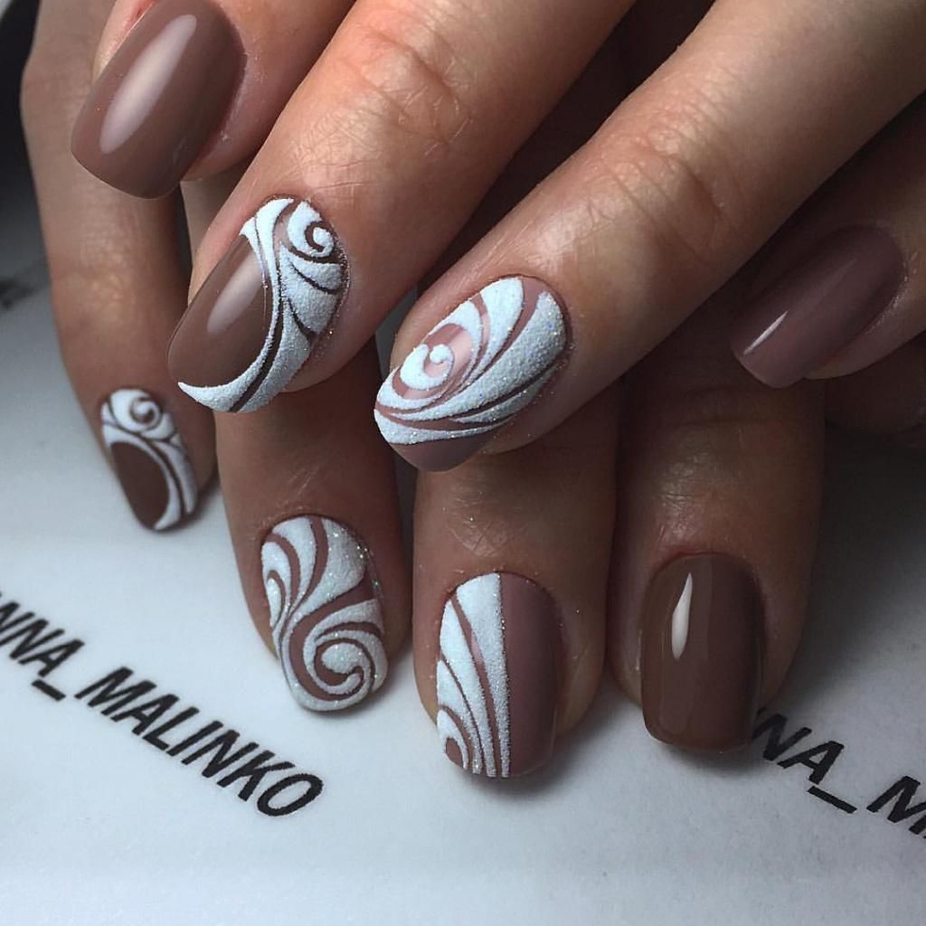 Практика показывает: маникюр варианта «кофе — шоколад» не темный, если вам удастся найти нужное сочетание оттенков и рисунка