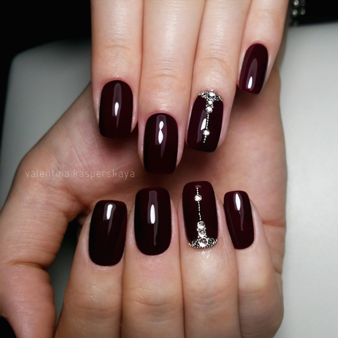 Шикарно смотрится однотонный коричневый маникюр с черными камнями в прикорневой зоне. Дизайн выглядит несложно, но и не банально. Такой маникюр делает ноготки изящными и утонченными.
