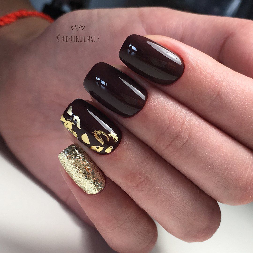 Придумать более гармоничный тандем очень сложно, ведь коричневый цвет в любом оттенке идеально сочетается с золотом. Объединения могут быть любые: френч, лунный нейл-арт, роспись и т.д.