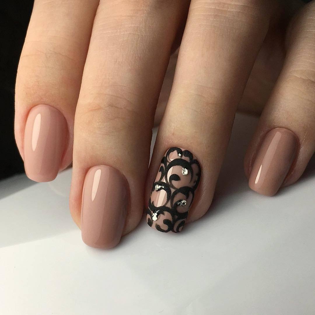 Шикарно смотрится однотонный коричневый маникюр с черными камнями в прикорневой зоне. Дизайн выглядит несложно, но и не банально. Такой маникюр делает ноготки изящными и утонченными.