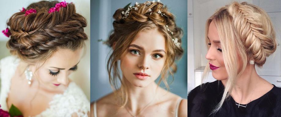 Плотная трехпрядная косичка вплетается в затылок или около виска, оборачивается вокруг головы над лбом, направляется к противоположному уху и закрепляется в нескольких местах незаметно.