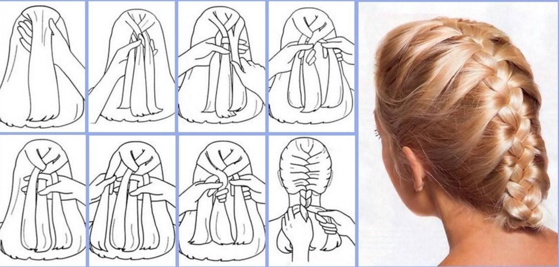 Плетется на затылочной части головы, либо начиная ото лба. Первый вариант часто называют колоском, а второй дракончиком. Можно выполнять косу классическим способом или вывернутым. На схеме вы увидите, как правильно ставить пальчики, чтобы перекладывать пряди было просто, и они не путались между собой.