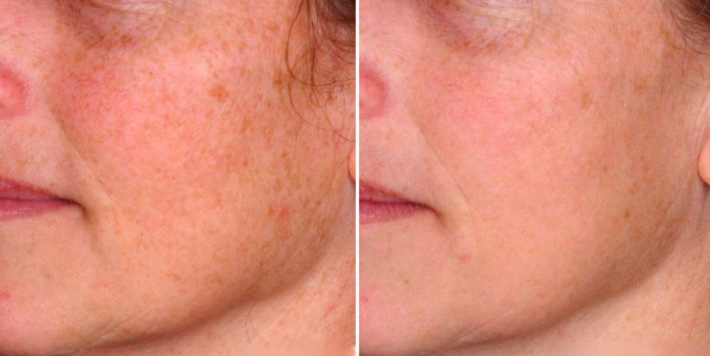 - фотоомоложение: осветление пигментных пятен, ускорение синтеза коллагена посредством импульсного светового потока.