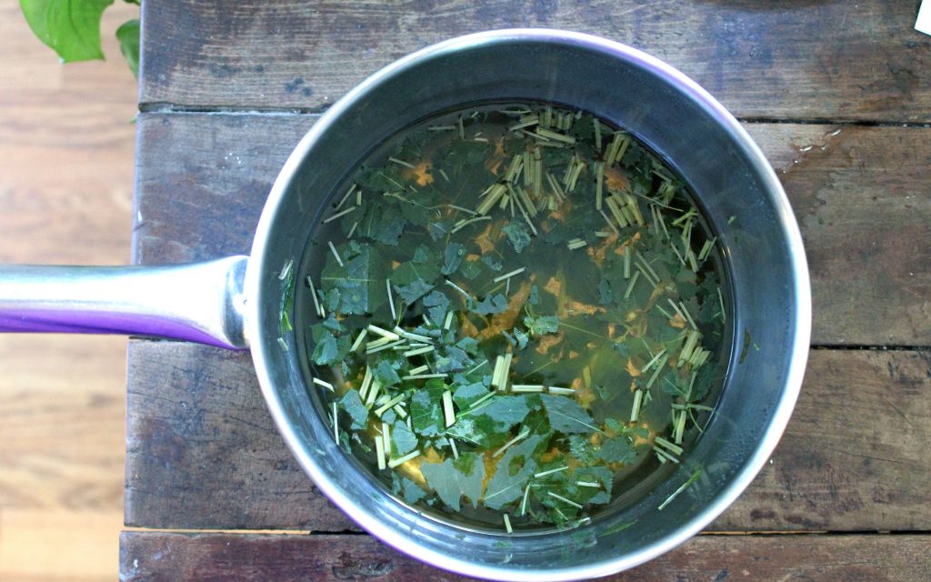 Лопух и крапиву залить кипятком и держать на слабом огне 15 минут. Накрыть и настаивать в течение 20 минут. Процедить и ополоснуть голову после мытья. Можно использовать через день.