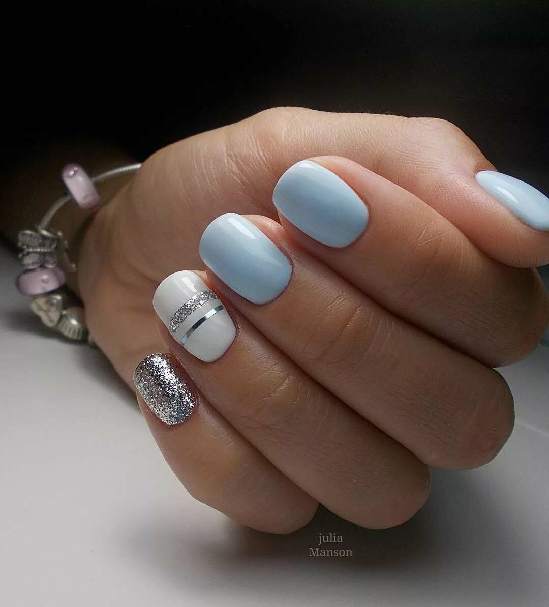 Универсальные варианты, подходящие под любую длину и форму ногтей. Они отлично смотрятся в сочетании с весенне-летними трендами, а голубые пастельные тона задают тренд в зимнем маникюре 2023 года.