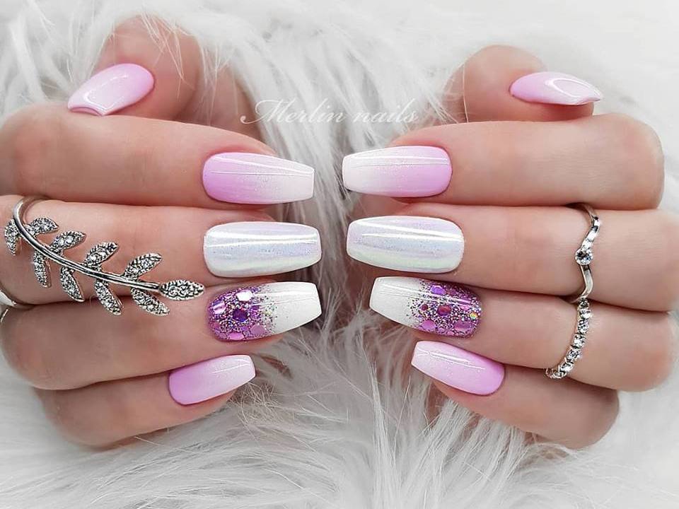 Хотите чего-то оригинального? Попробуйте молочный маникюр, при этом украсьте один ноготок серебряным глиттером. Образ ваш будет в целом очень стильный. Любите узоры? Значит смело экспериментируйте с серебром. Лучшие варианты такого декора: лунный дизайн, зеркальная втирка, «вязанный» маникюр. На молочном цвете золотые и серебряные узоры не будут выглядеть лишними. Выделяйте один или несколько ноготков золотом или серебром, будьте оригинальны и женственны.
