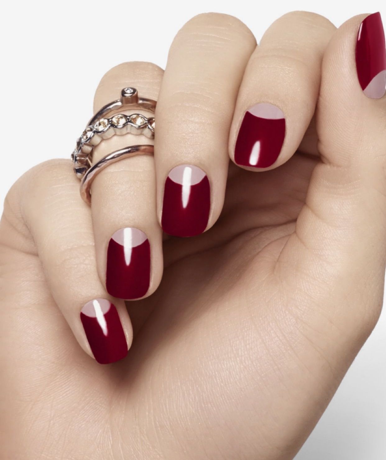 Обратите внимание на такие оттенки, как светло-красный, алый, ярко-красный или бордовый, которые стоит украсить тонкими линиями черного цвета. Достаточно эффектно и популярно наносить лунный маникюр с алым или бордовым лаком, на котором выполняют белые, черные или бежевые полосы в геометрическом стиле