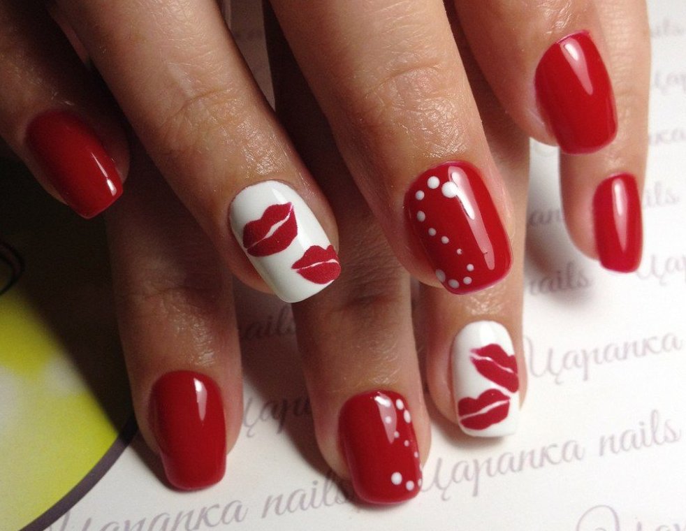 Не менее популярен маникюр красный с белым. Интересно смотрится геометрический дизайн, раскраска в тон новогоднего шара, имитация шкуры зебры, белые цветы на красном фоне, градиентный бело-красный дизайн. Можно создать нежный дизайн, добавив к красному немного белых пятнышек, цветков. Многие мастера предпочитают окрашивать все ногти в алый цвет, а рисуют лишь на безымянных ноготках.