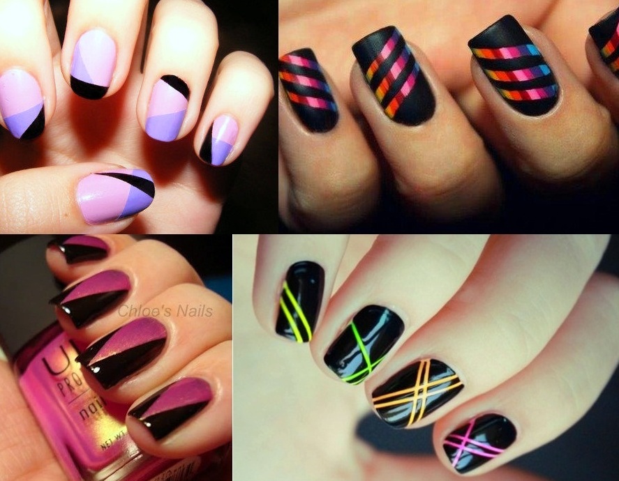 - Графическая разметка ногтевой пластины с использованием трафаретов. Для этого на подготовленный ноготь наносится красный тон так, чтобы не задеть контурную линию кутикулы. Старайтесь прокрасить ноготь со всех сторон, чтобы избежать белых просветов или нежелательного эффекта штриховки. Когда красная основа высохла, на ноготь наклеивается трафарет в виде полосок, квадратов, треугольников или кружков. Ноготь повторно покрывается лаком, но уже черного цвета (лучше использовать лак с кистью, в которой острый кончик). Когда покрытие высохнет, нужно аккуратно удалить трафареты. В завершение используем прозрачный лак с зеркальным отблеском.