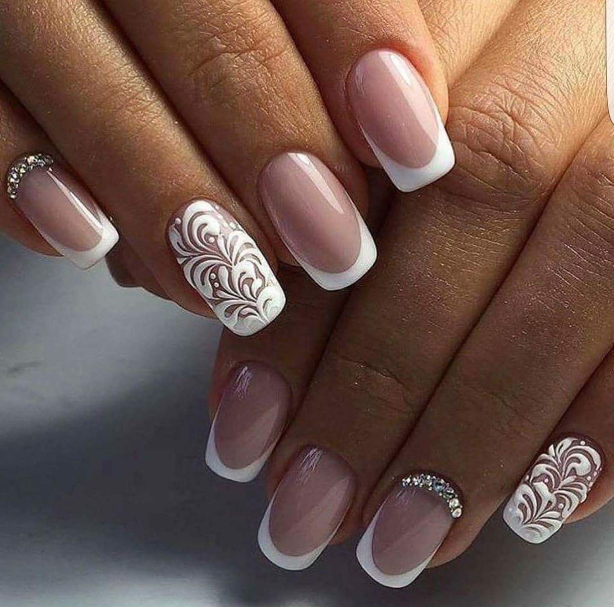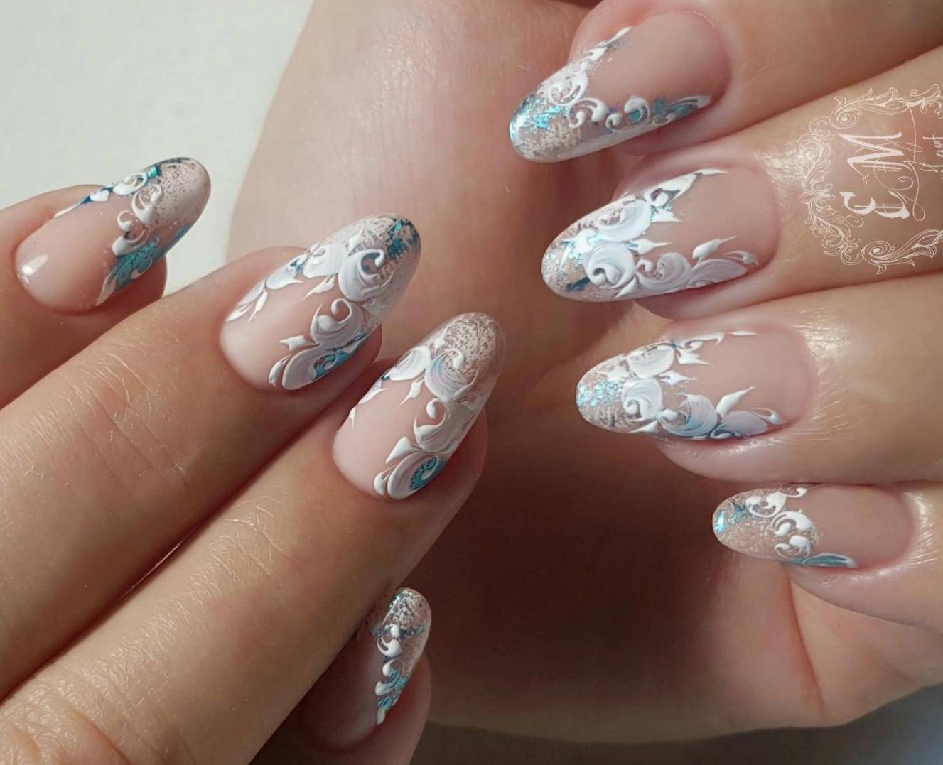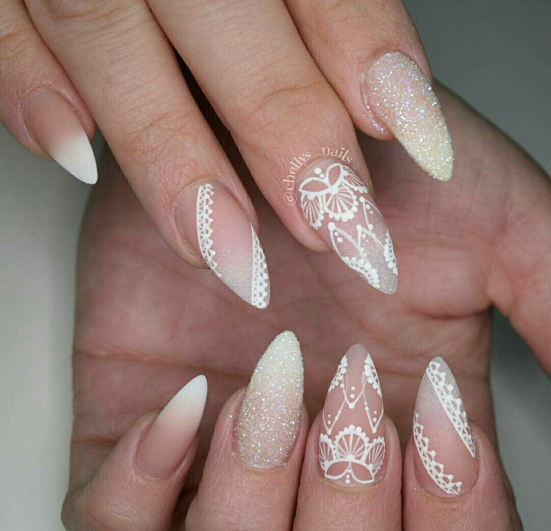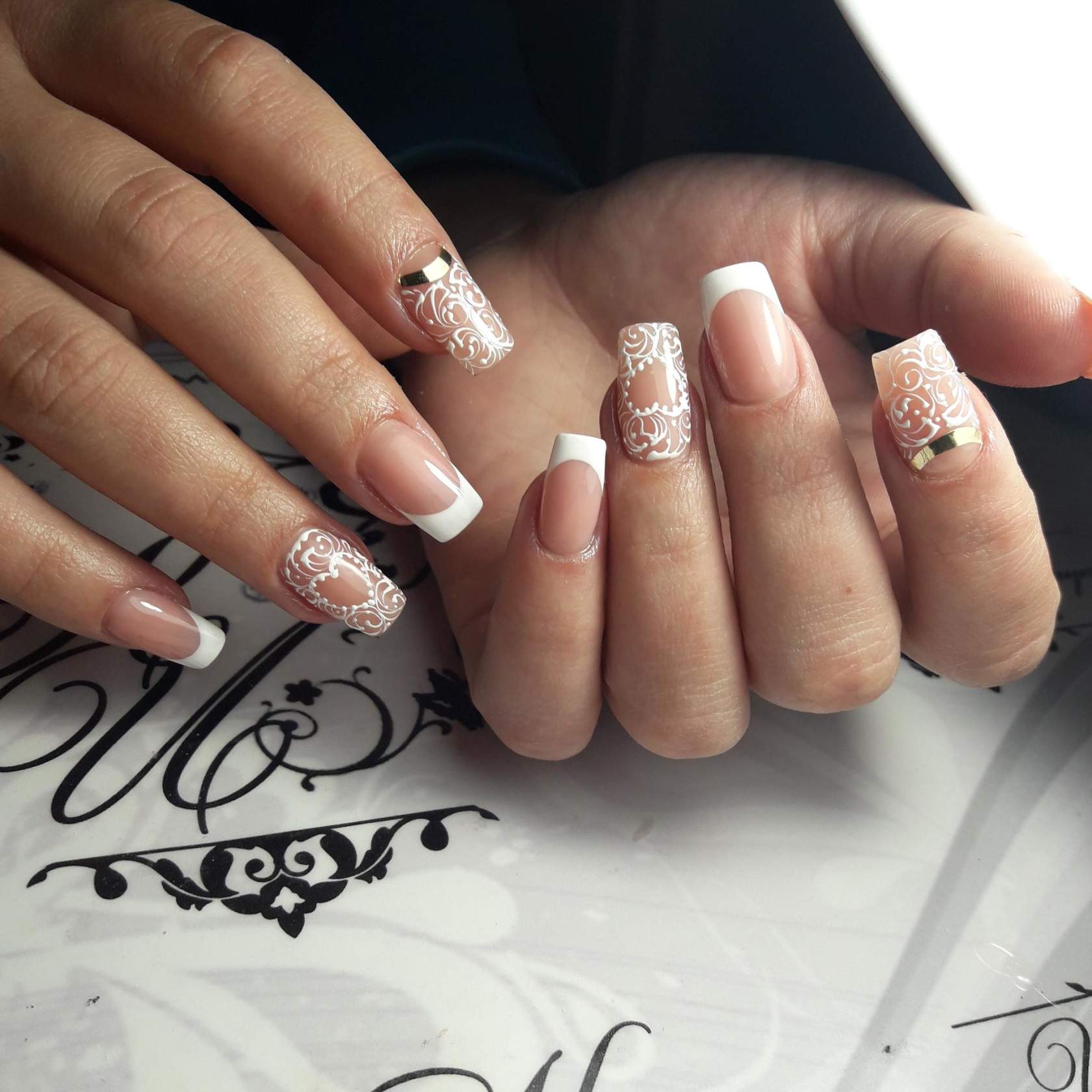 Очень эффектно будут смотреться белые кружевные вензеля, в сочетании с френчем или блестящим дизайном, на длинных острых ногтях.