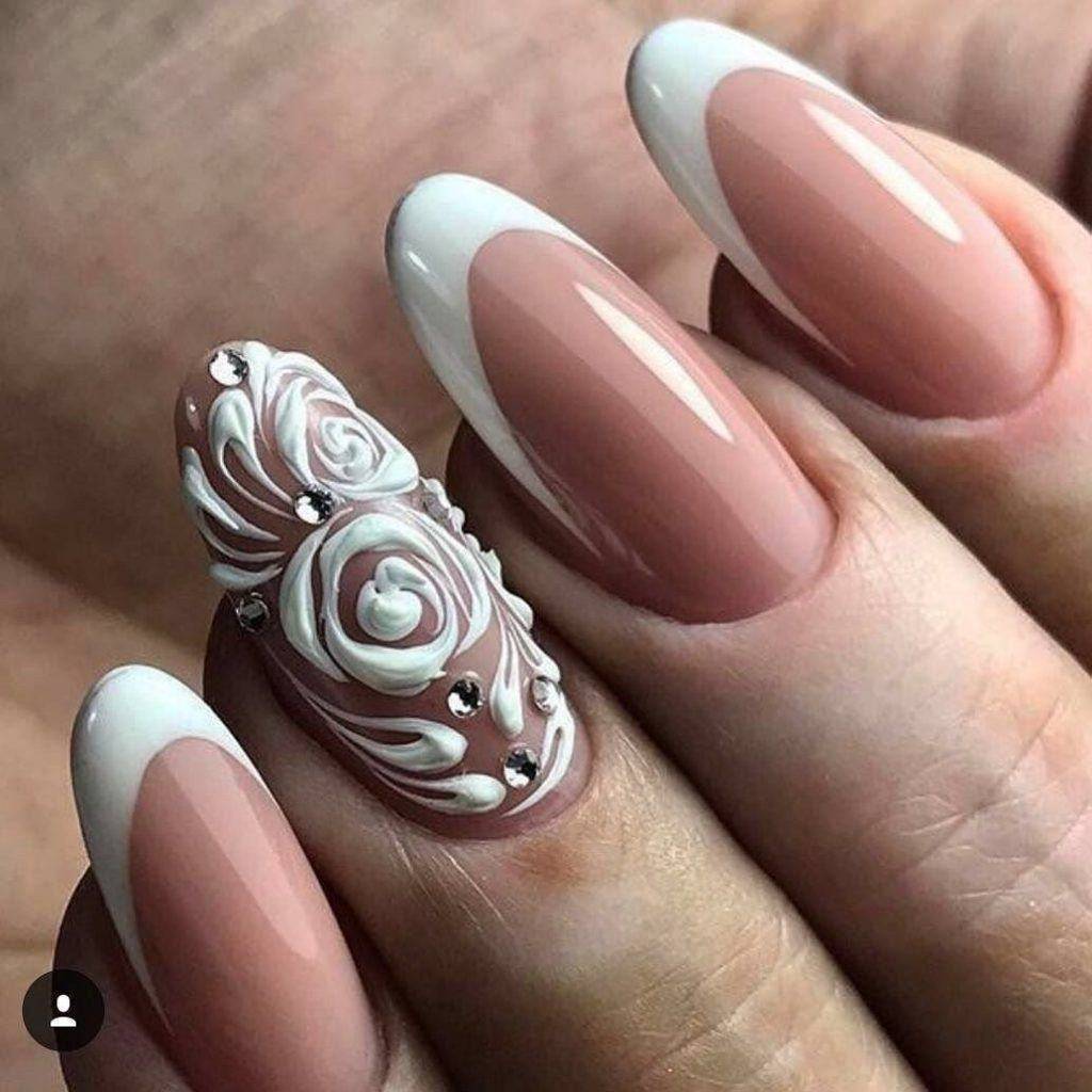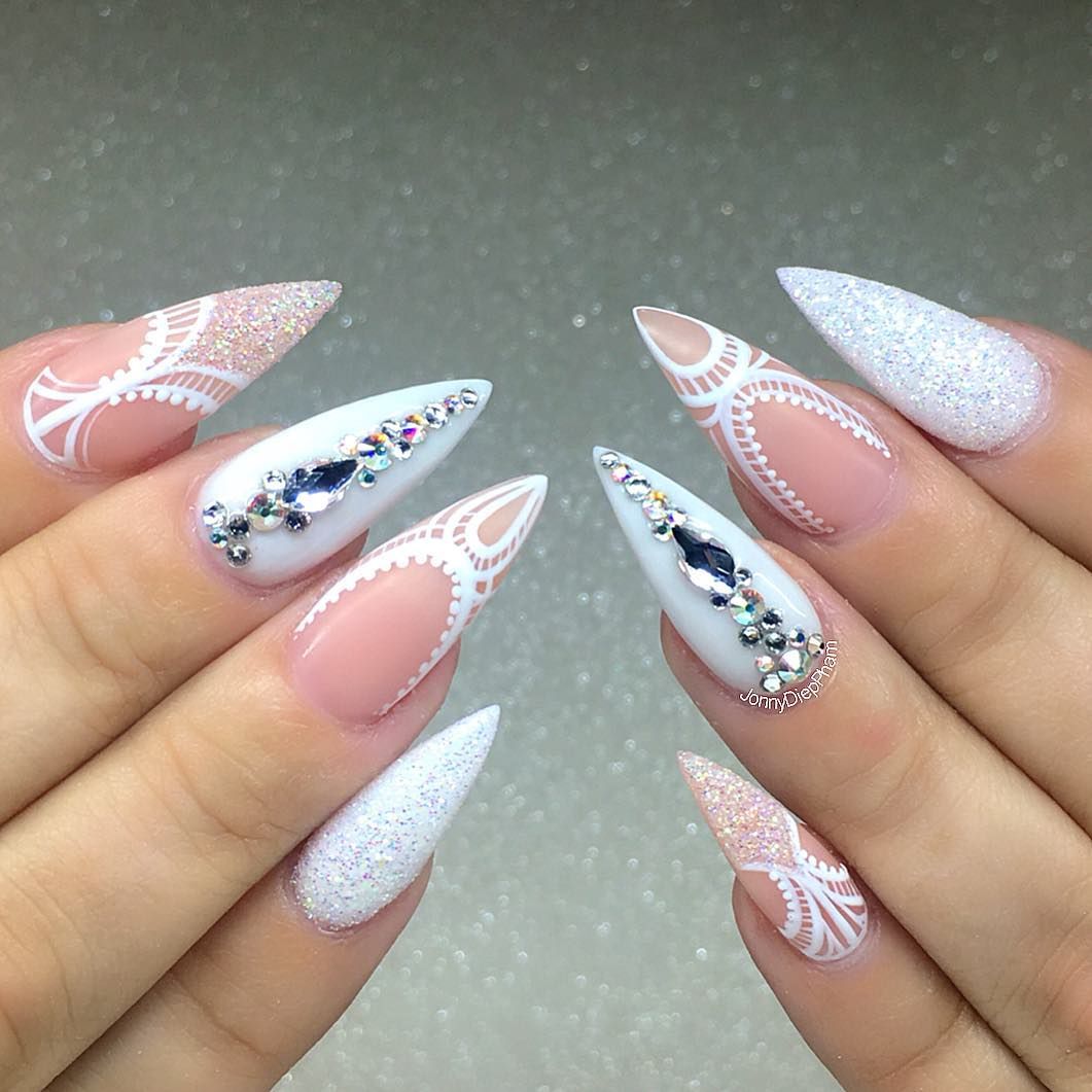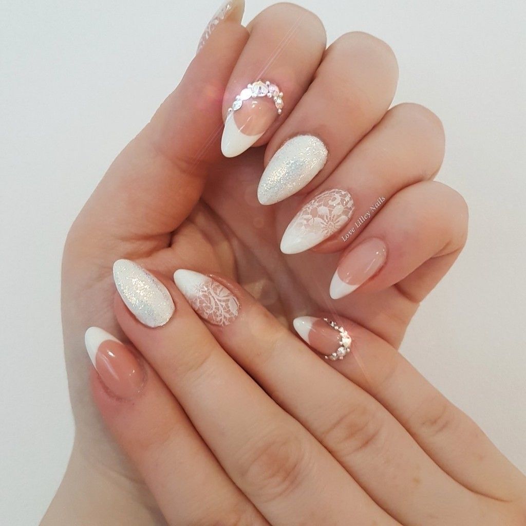 Очень эффектно будут смотреться белые кружевные вензеля, в сочетании с френчем или блестящим дизайном, на длинных острых ногтях.