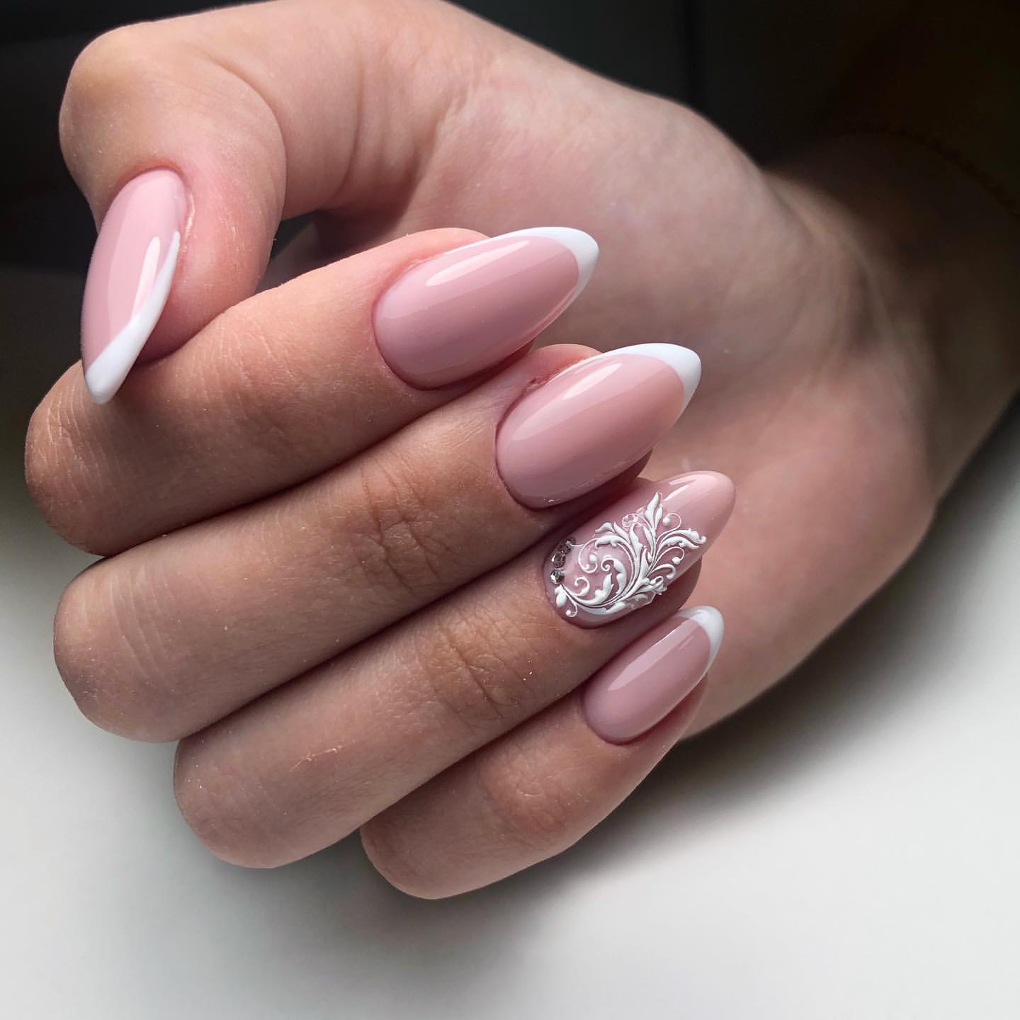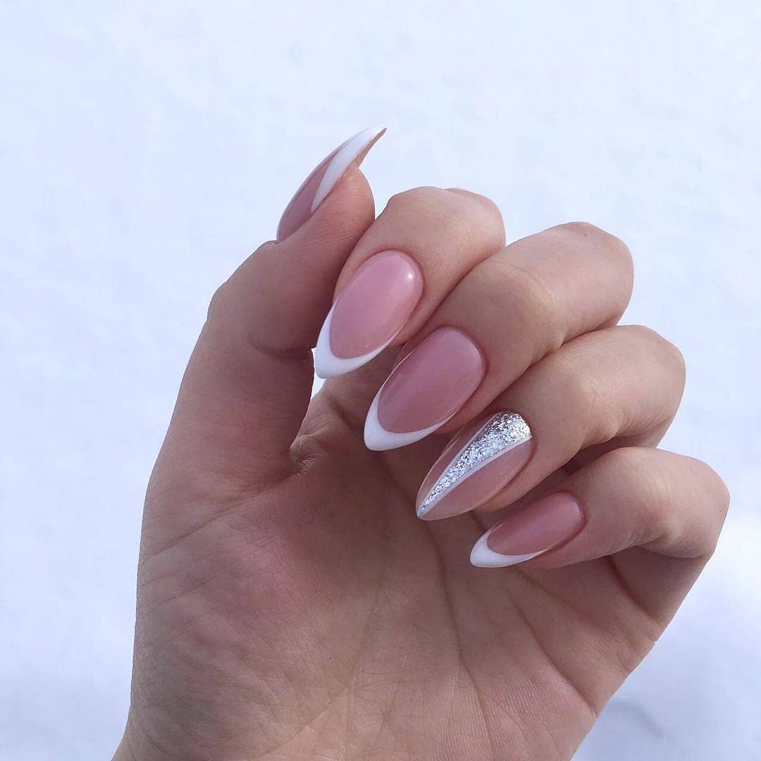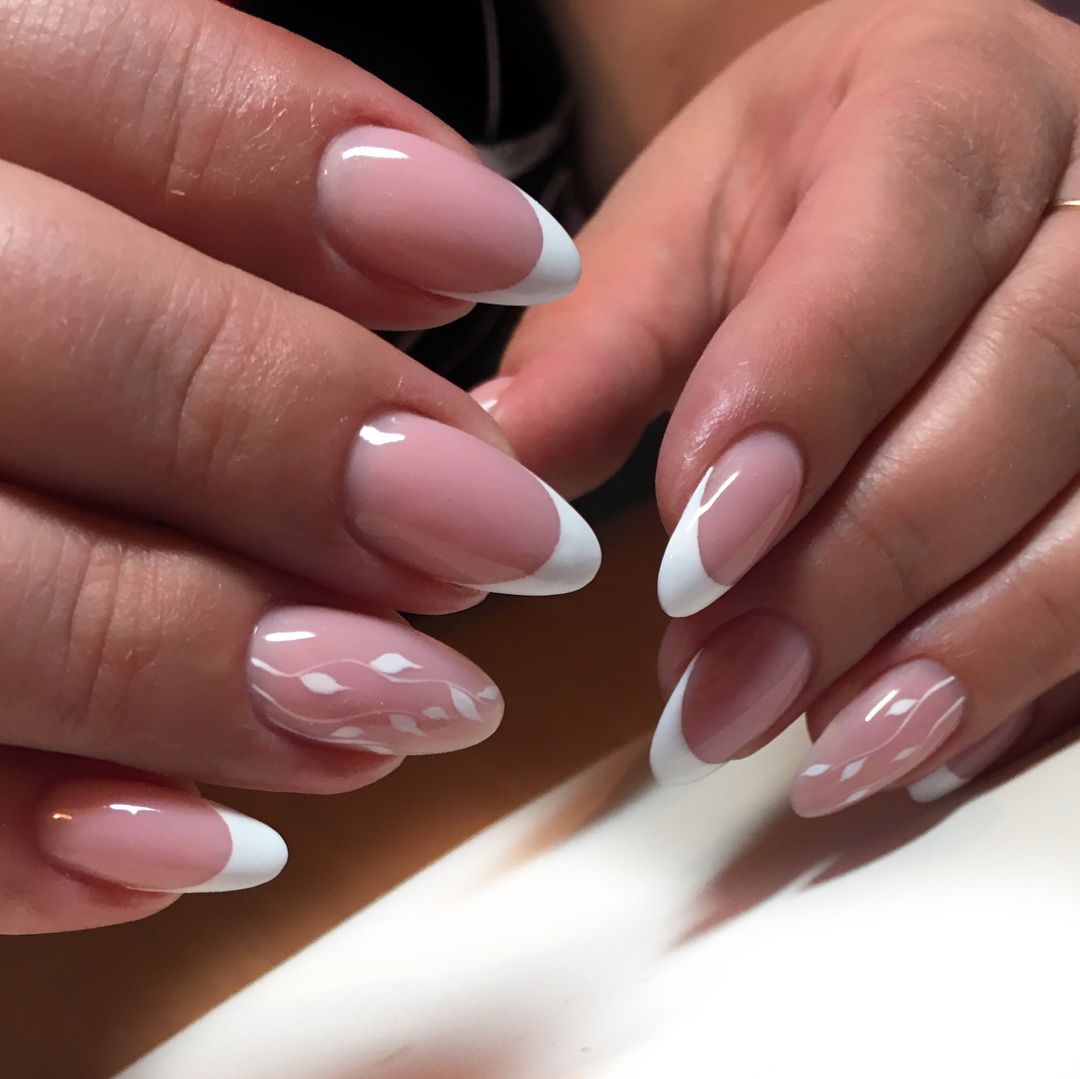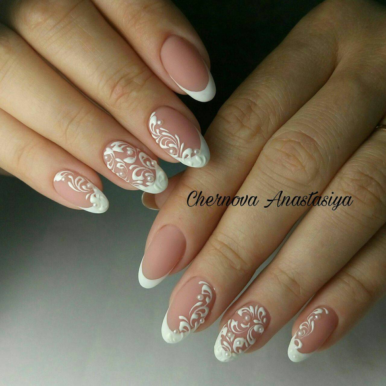Очень эффектно будут смотреться белые кружевные вензеля, в сочетании с френчем или блестящим дизайном, на длинных острых ногтях.