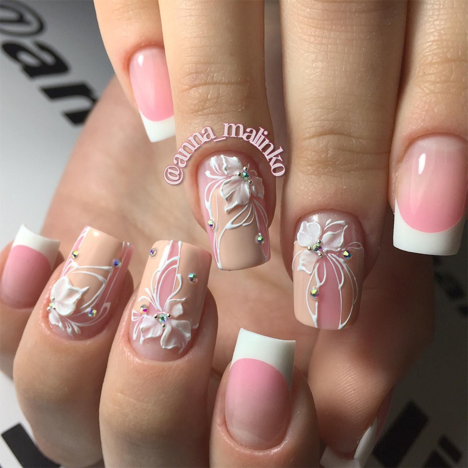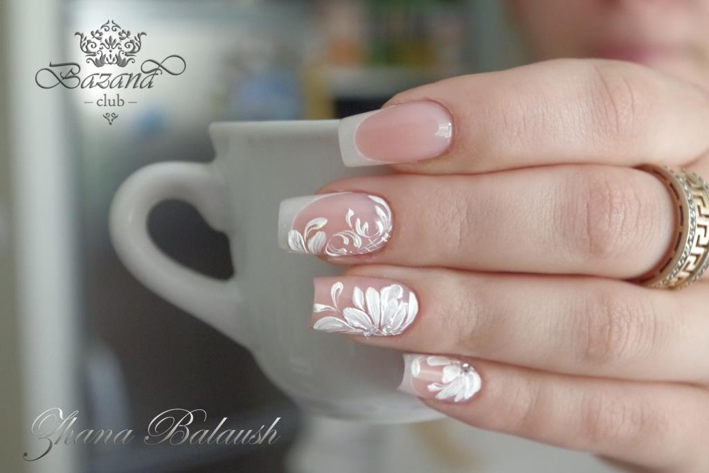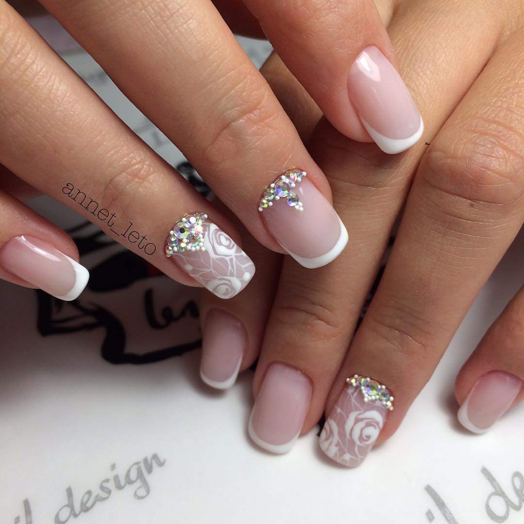 Наклейки или роспись на ногтях отлично дополнять свадебный френч. Рисунки должны быть не слишком яркие. Цветы, узоры, завитки – лучшие варианты для торжества.