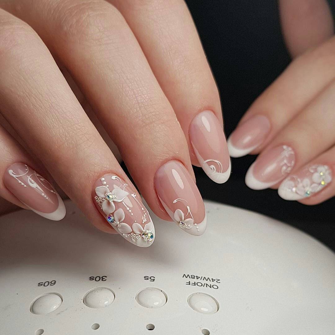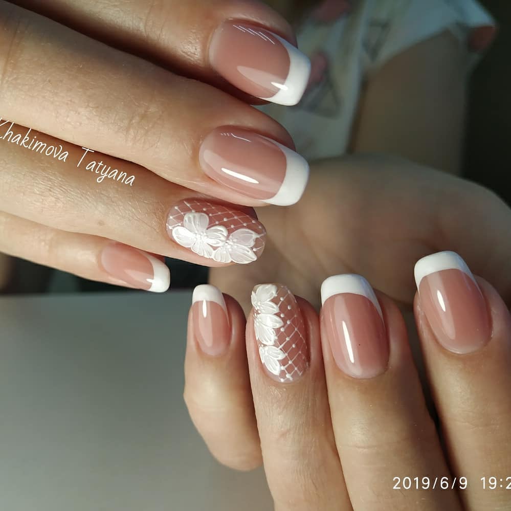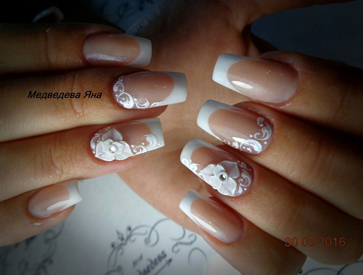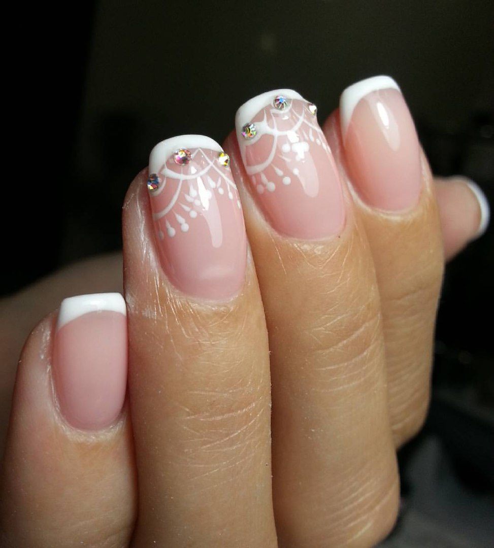 Классический белый френч, как универсальный вариант, подойдет под любое платье, любой образ невесты. Если вы хотите добавить интересных акцентов, то можно добавить рисунки или декоративные элементы. Стразы, бульонки отлично подходят для свадебного дизайна.