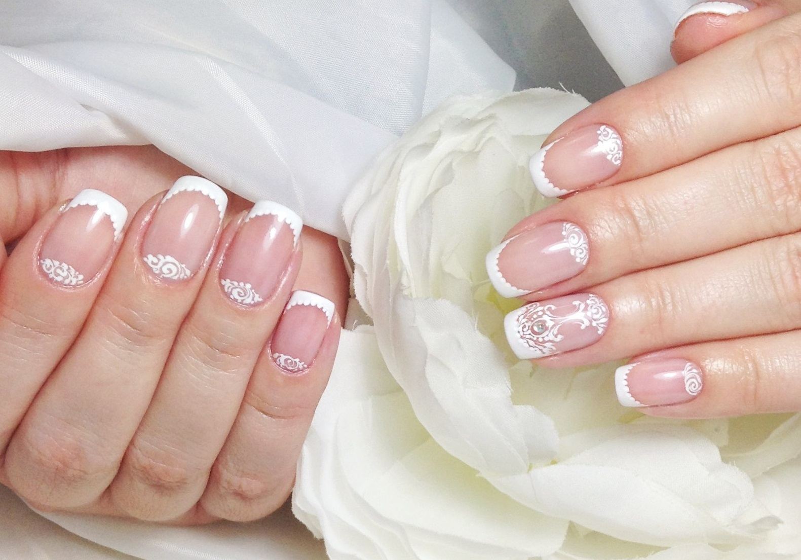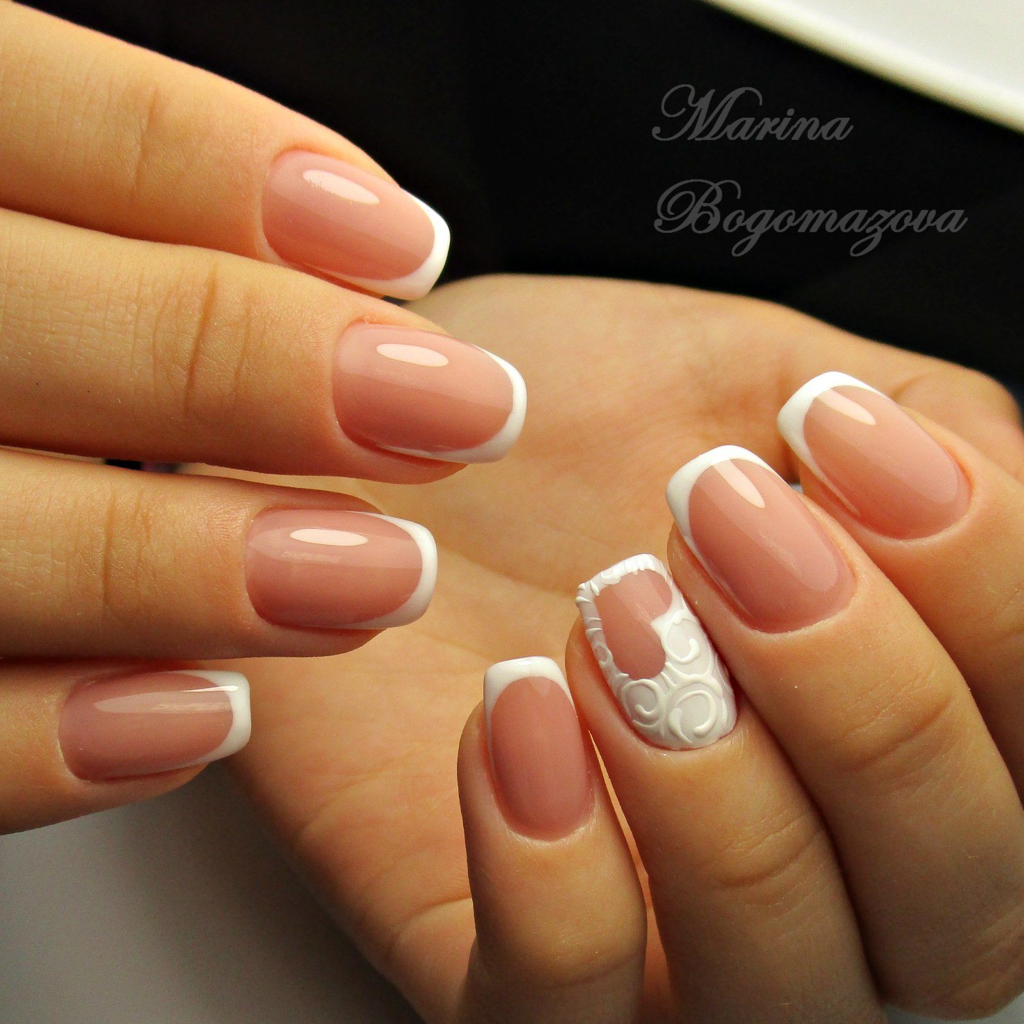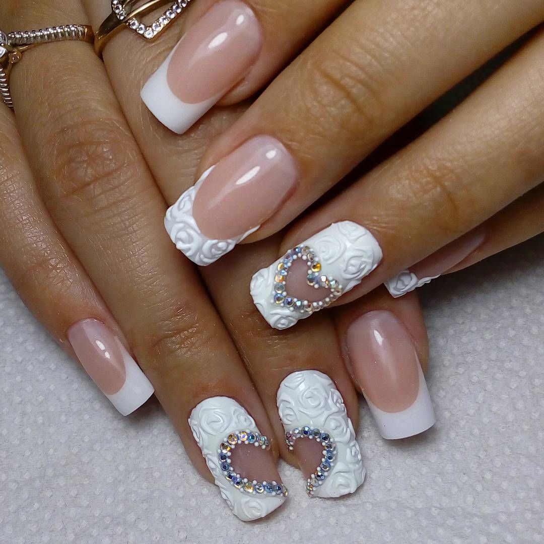 Классический белый френч, как универсальный вариант, подойдет под любое платье, любой образ невесты. Если вы хотите добавить интересных акцентов, то можно добавить рисунки или декоративные элементы. Стразы, бульонки отлично подходят для свадебного дизайна.