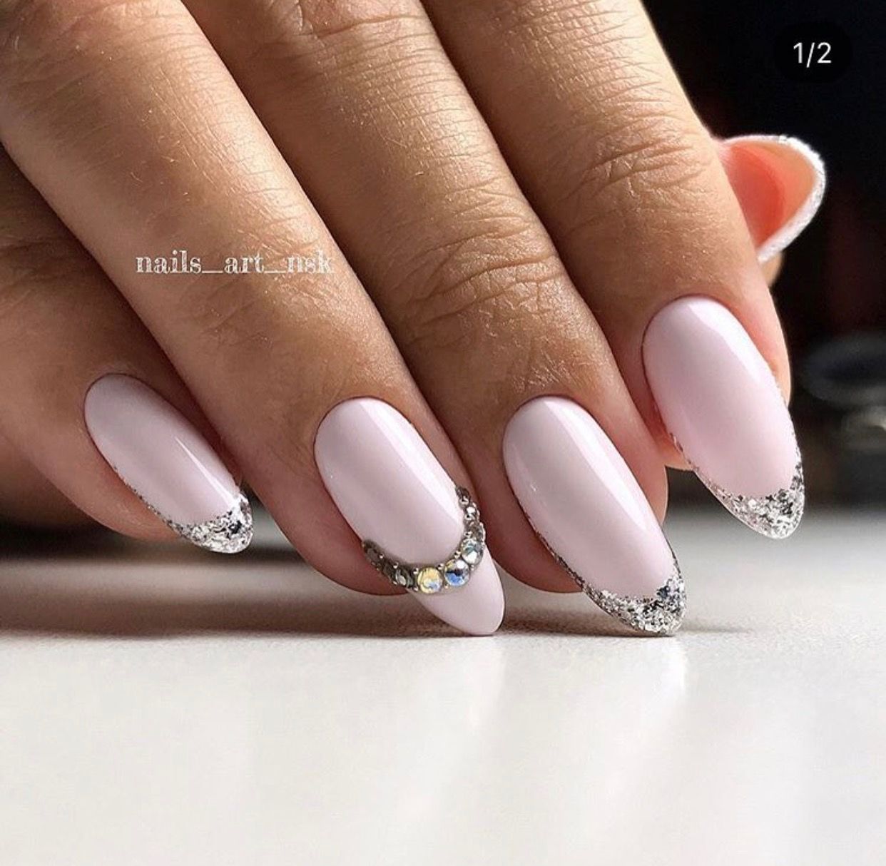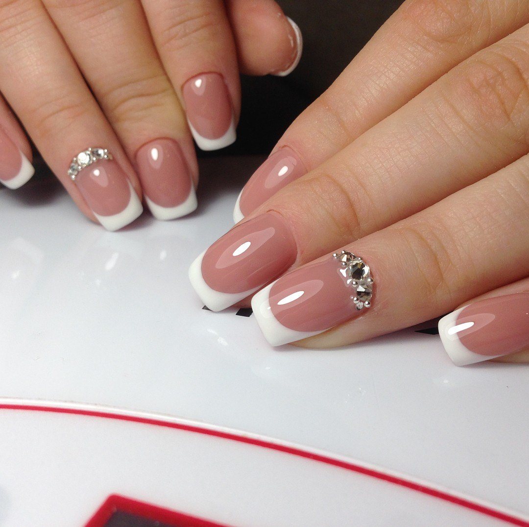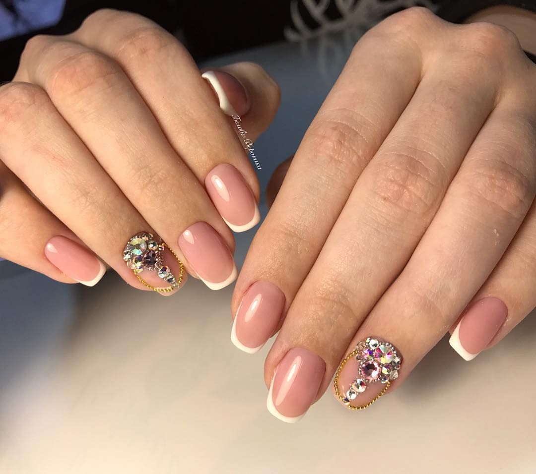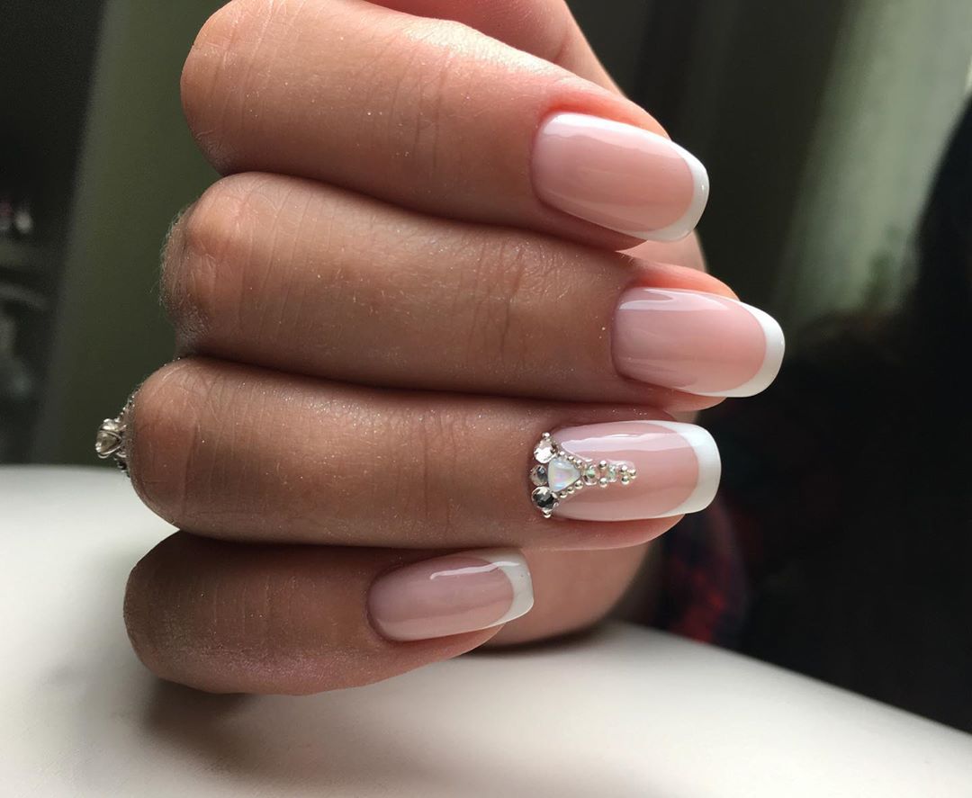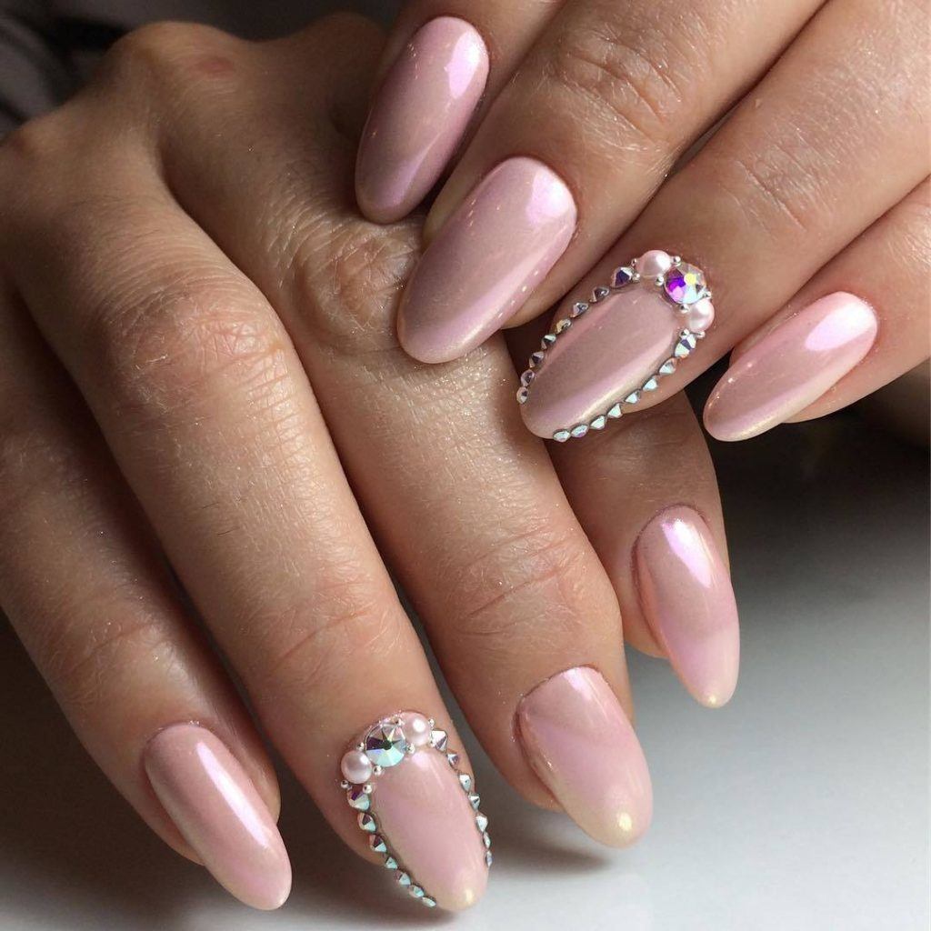 Если хочется чего-то более легкого и простого, то можно покрыть все ноготки бледно-розовым, молочным или нюдовым гель-лаком, и один или два ногтя украсить светлыми стразами или блестками.