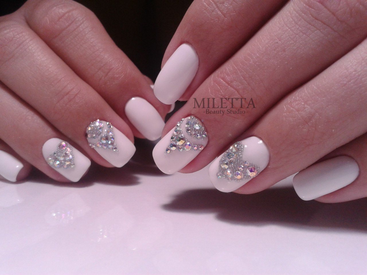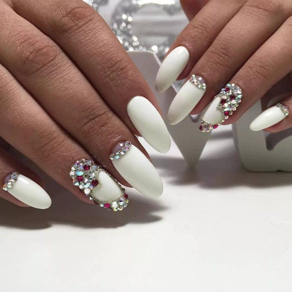 На длинных ногтях квадратной формы очень красиво и стильно будет смотреться белый гель-лак с блестками и стразами.