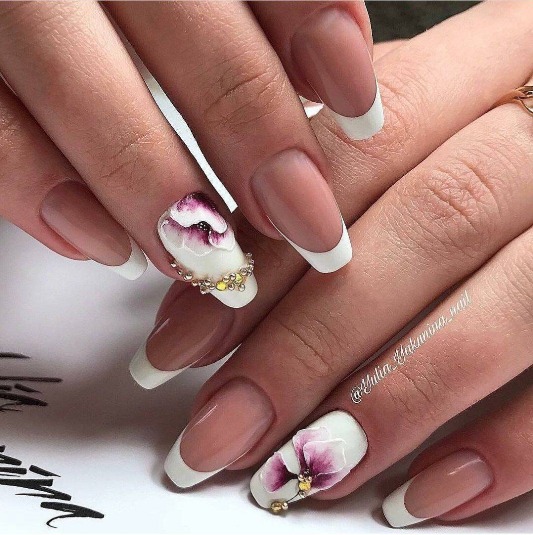 Посмотрите, как нежно и красиво смотрится френч, украшенный рисунками цветов, на коротких ноготках.