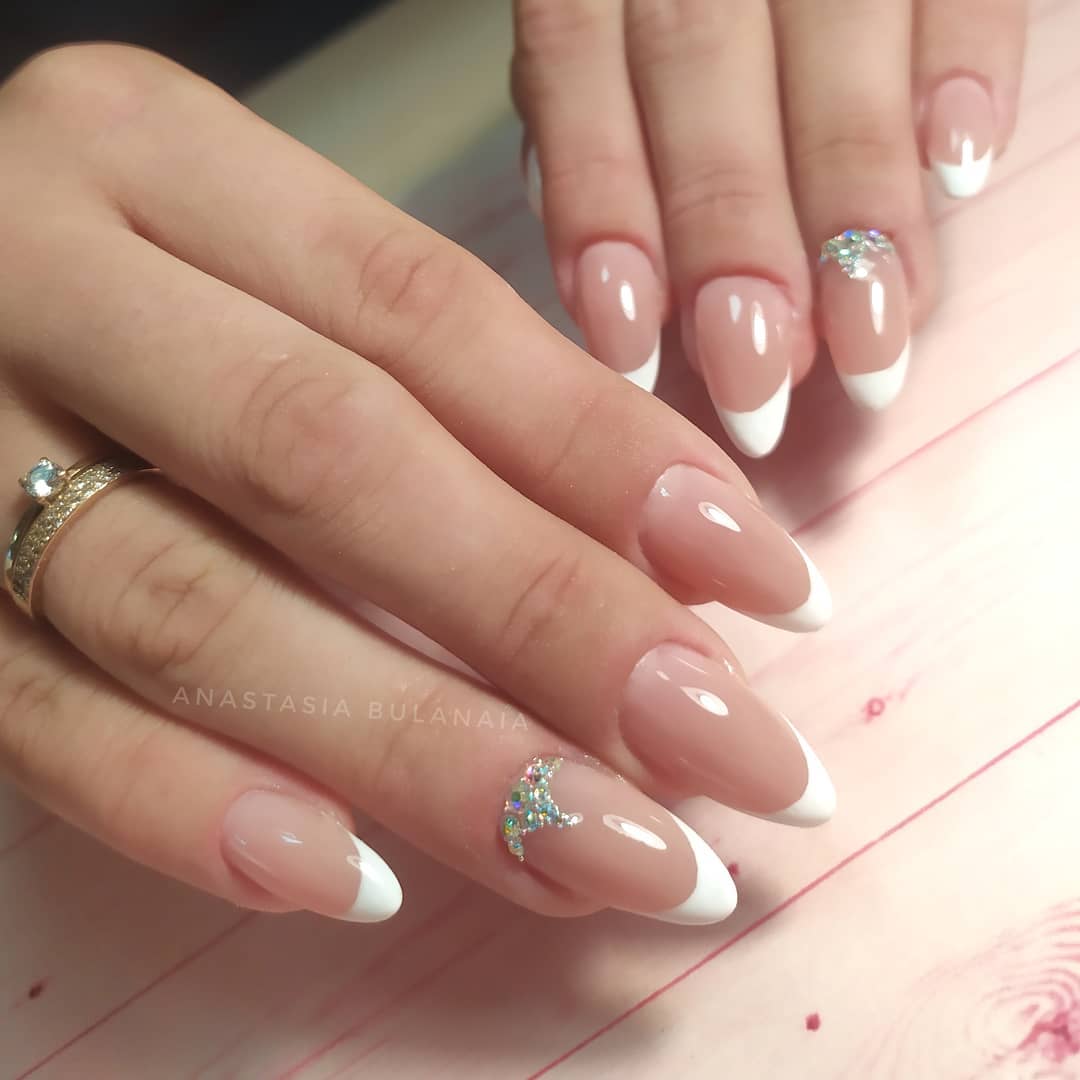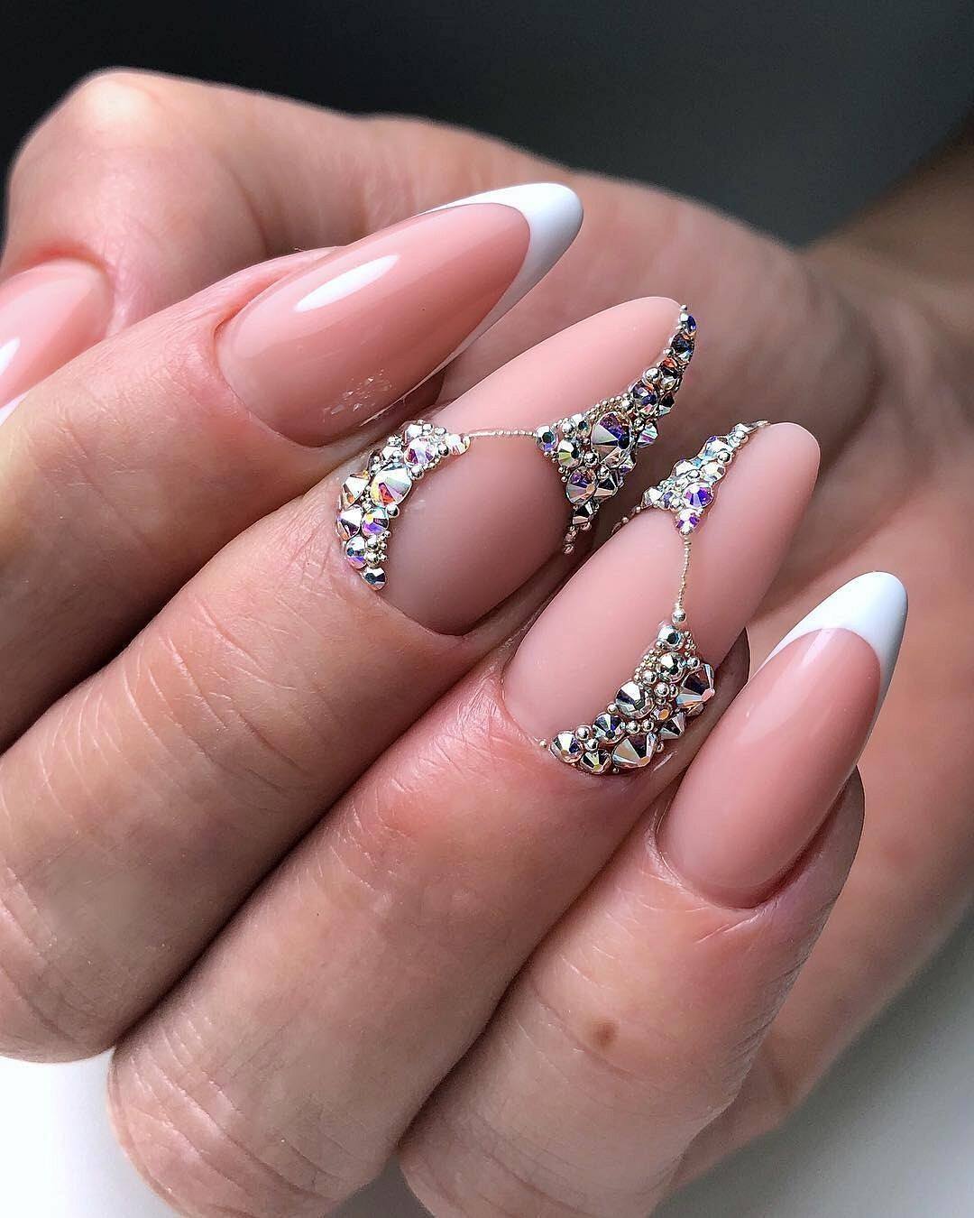 На длинных ногтях миндальной формы очень стильно будет смотреться френч со стразами на нюдовом фоне.