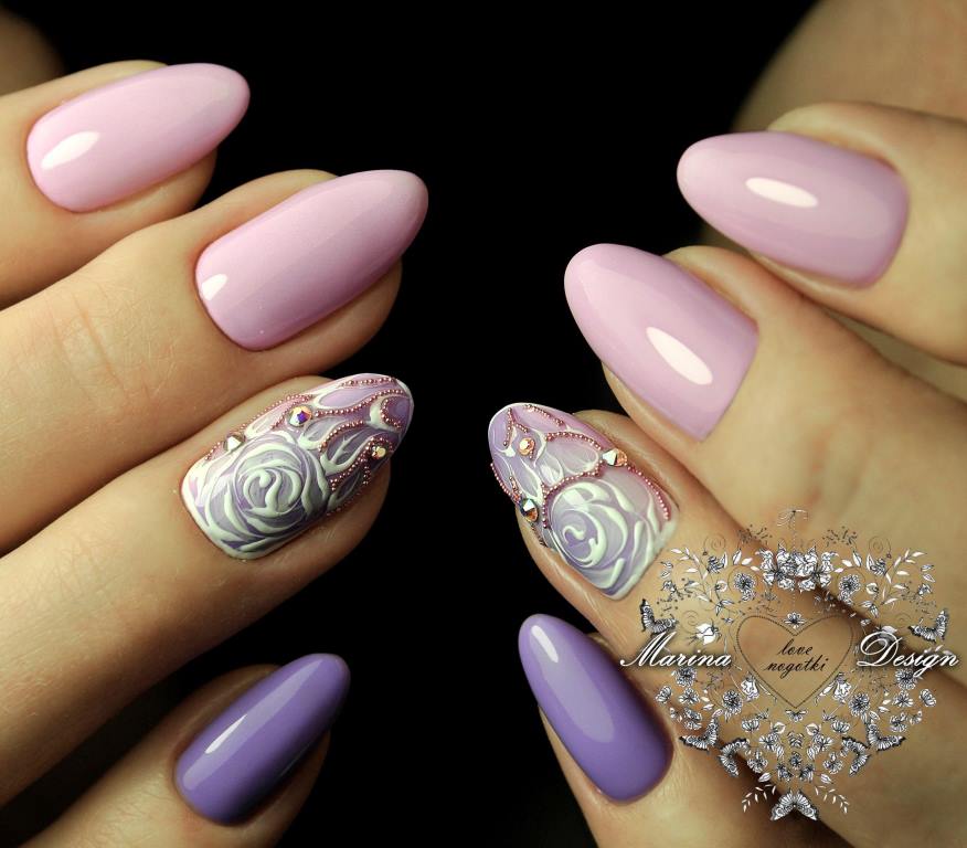 На овальных ногтях шикарно будут смотреться однотонные покрытия гель-лаком, втирка и симметричные аккуратные узоры.