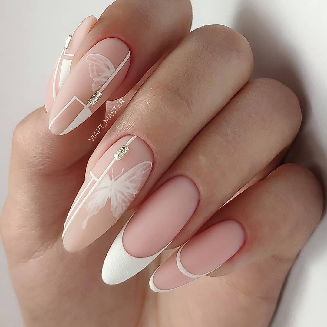 Летний маникюр – нюдовые оттенки лаков с присутствием, геометрии или рисунков бабочек, цветов, фруктов и прочего.
