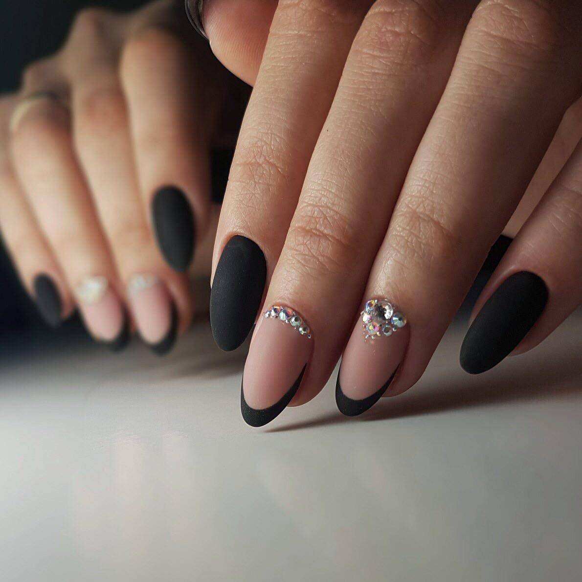 Красиво и элегантно выглядит матовый черный френч со стразами. Дизайн смотрится привлекательно на квадратных, овальных и миндалевидных ногтях. Эти лаконичные формы помогают создать нежные и аккуратные нейл-арты, которые не нуждаются в дополнительном декоре, помимо страз.