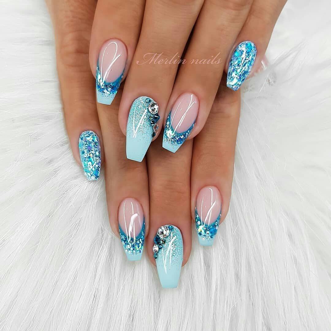 Френч всегда остается в тренде. Но особенно ярко он засверкает, если линия улыбки будет сделана не лаком белого цвета, а выложена сверкающими камушками. Причем ее ширину можно выбрать любую, совсем тоненькую, не превышающую ширины одного небольшого кристалла. Также допустимо выложить линию из двух или трех рядов камушков.