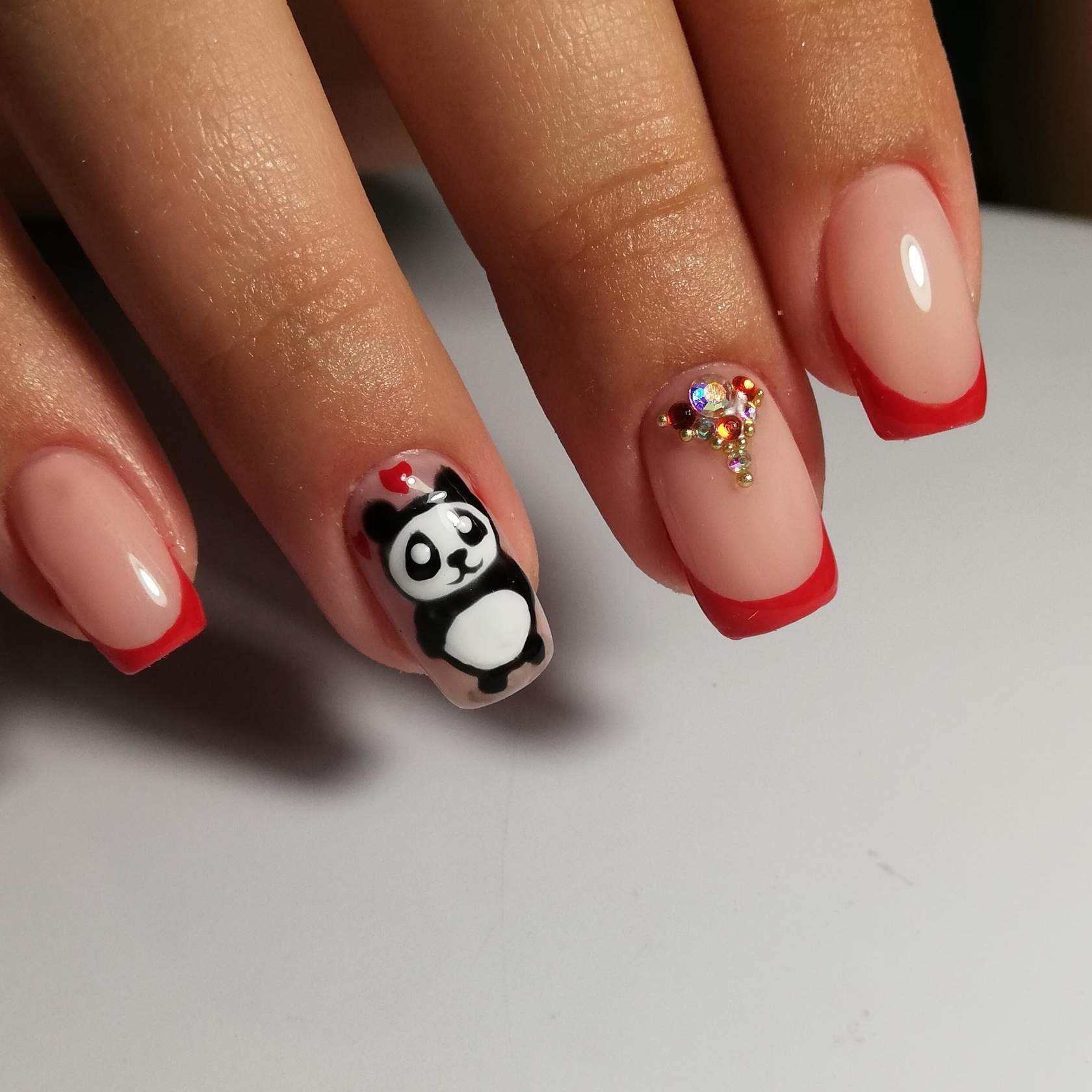 С белым френчем на ногтях отлично сочетаются стразы контрастных ярких цветов, например красные.