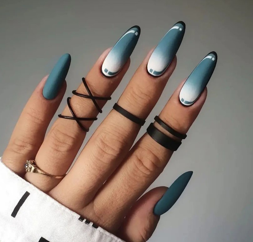 Стильно выглядят нейл-арты с негативным пространством и оригинальным краем ногтя на каждом пальце. Такие нейл-арты чаще всего выполняются в технике негативное пространство, в матовом исполнении, с серебряными фольгированными полосами.
