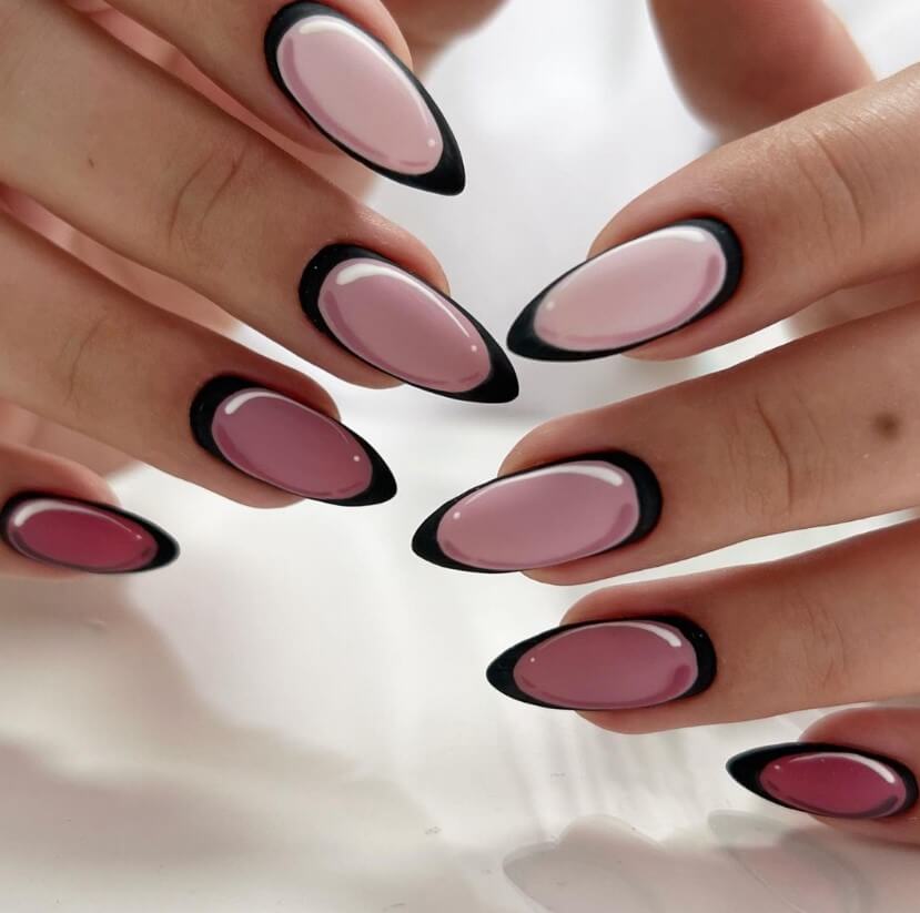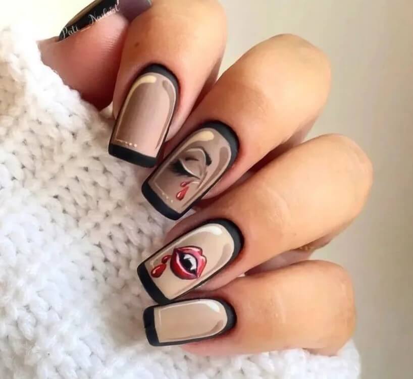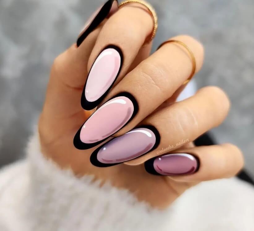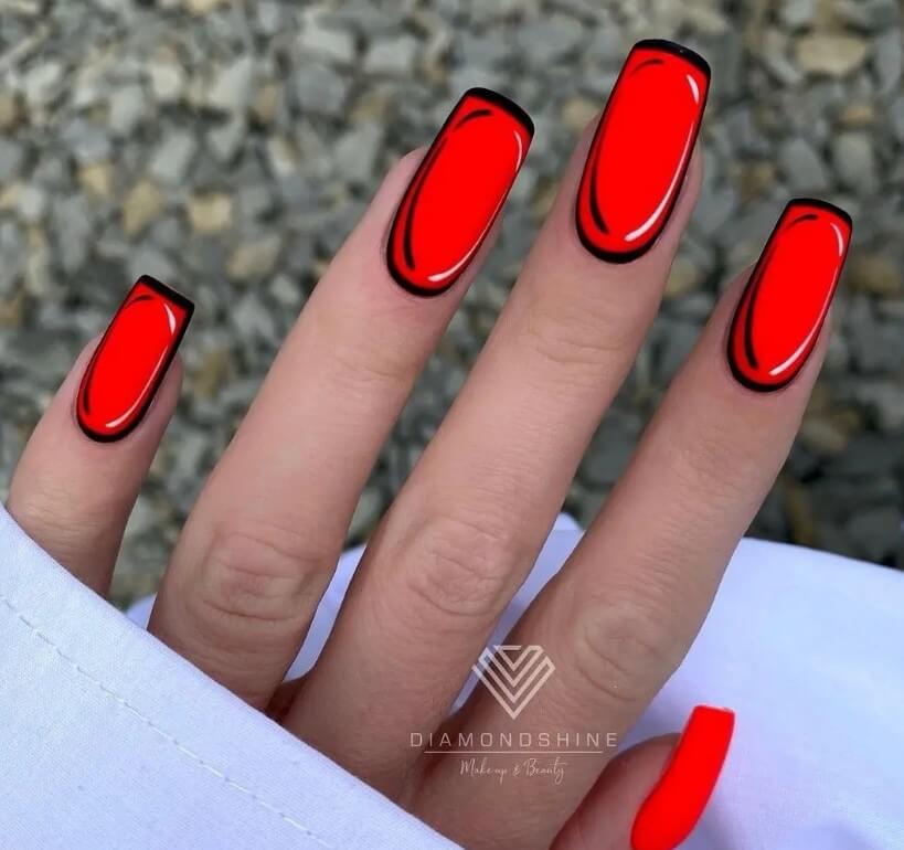 Для этого нейл-мастера красят ноготки в неоновый или пастельный цвет и по их периметру рисуют тонкие или толстые черные линии-контуры. А черным и белым лаком прорисовывают блики и тени.