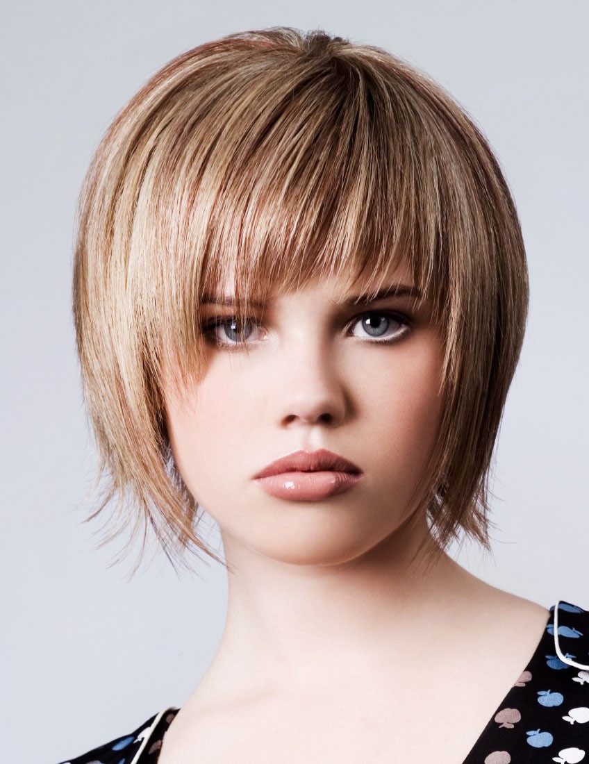 Асимметрия поможет зрительно вытянуть круглое лицо и скрыть его полноту, усилить эффект поможет объем на макушке, чтобы придать образу стильный эффект можно добавить к стрижке косую челку.